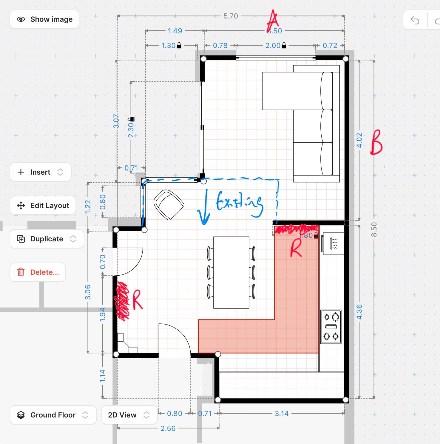 The bottom half of the room, up to the blue dotted line is the existing room which provides space for the kitchen and dining table.