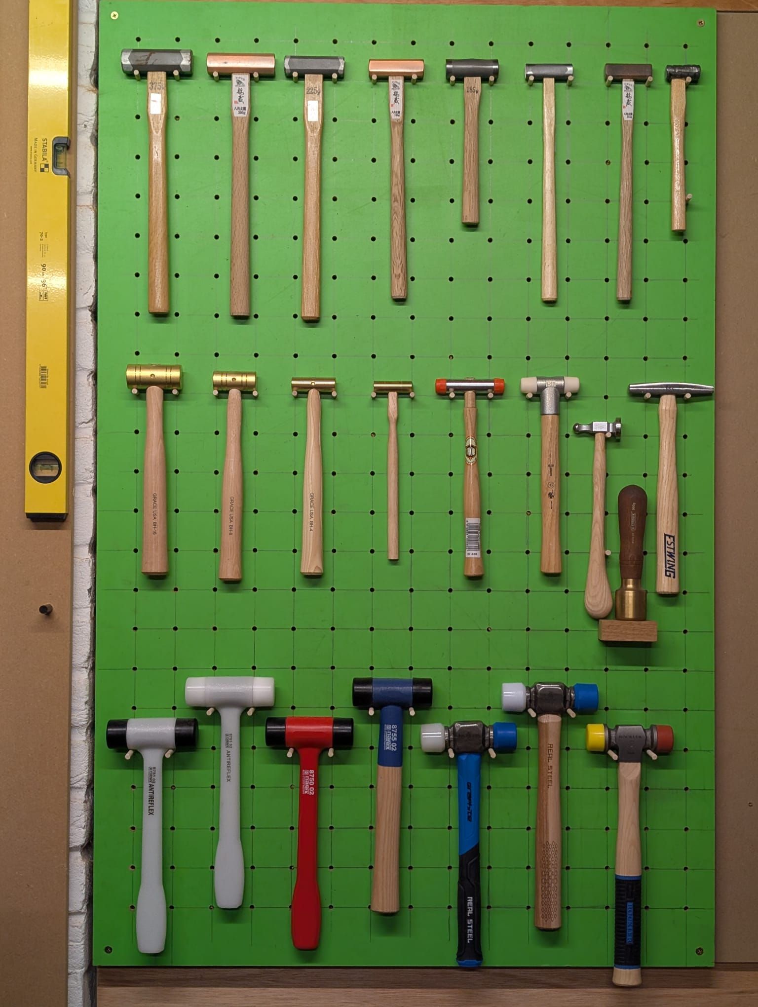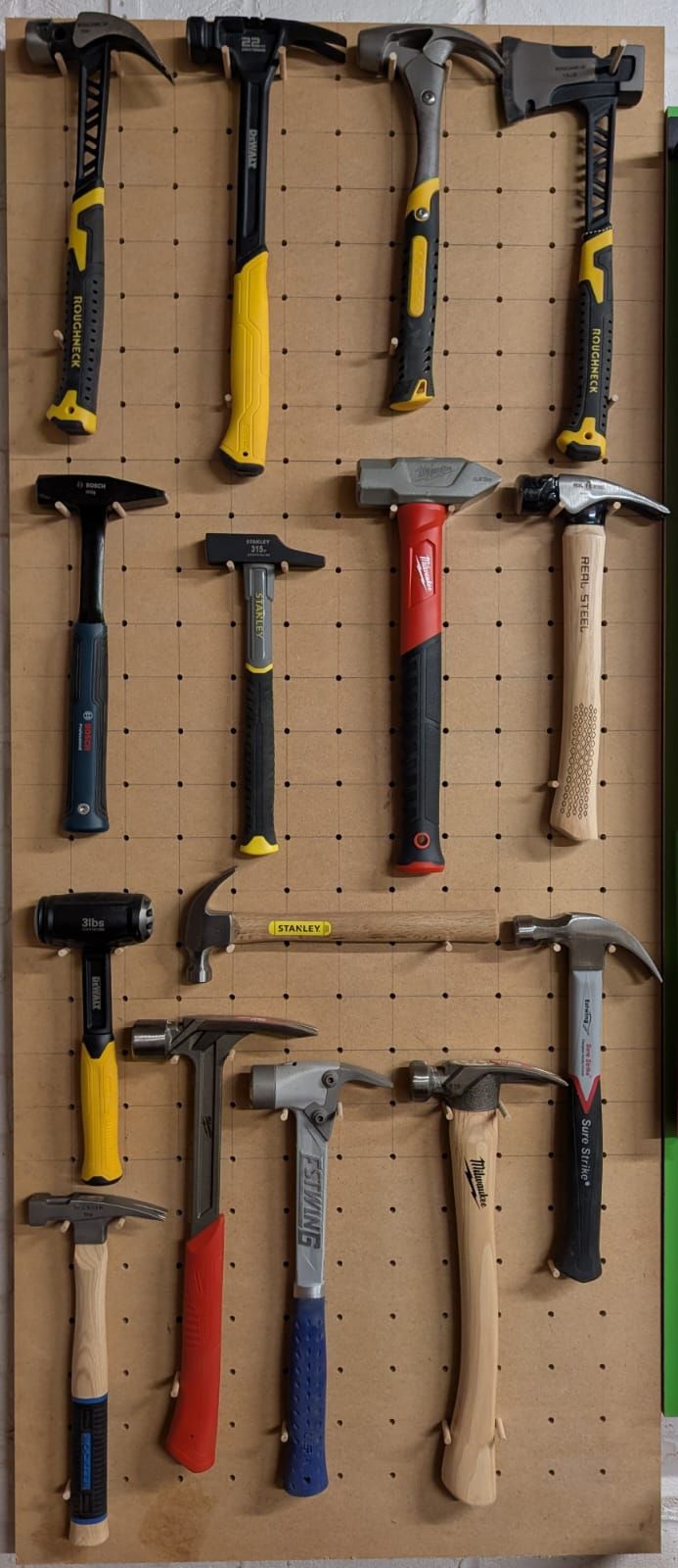 I wanted my own pegboard hammer wall, but couldn't find anything local, so I laid out grids and used a miles craft drill block to drill all the 6mm holes out. 12mm mdf sheet. I had 6mm 30cm dowel rods from previous jobs, so I just used these. Used the same drill block elsewhere as well, excellent bit of kit.