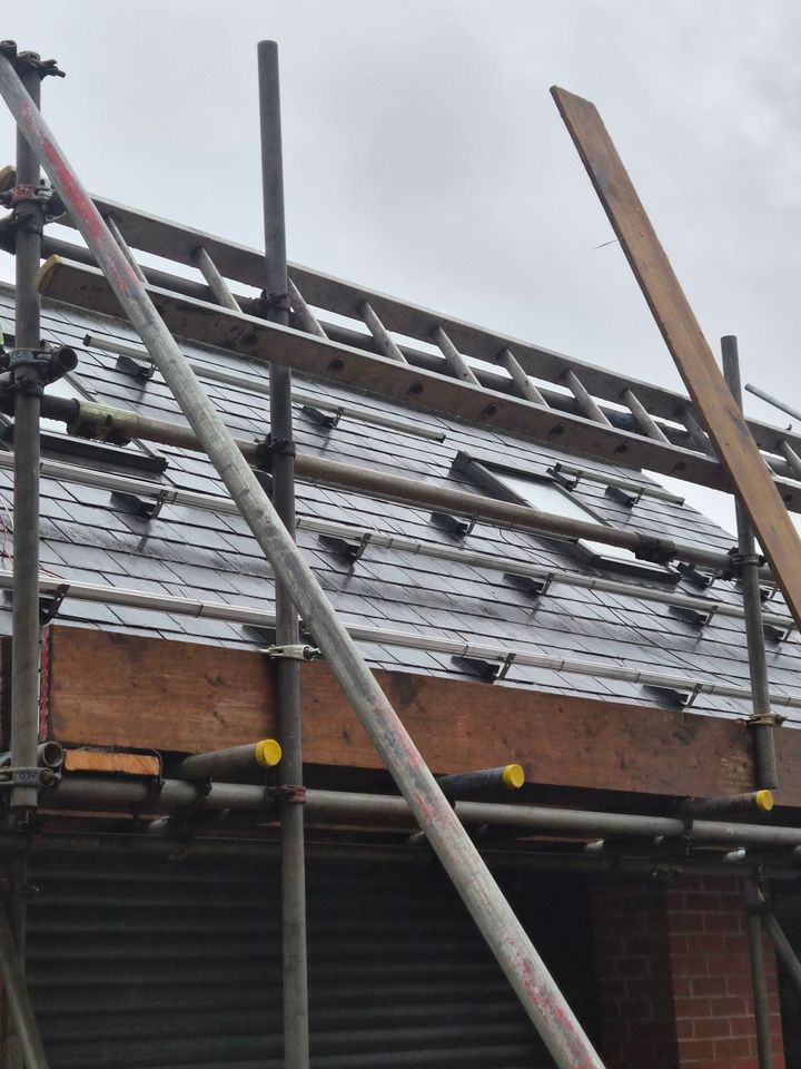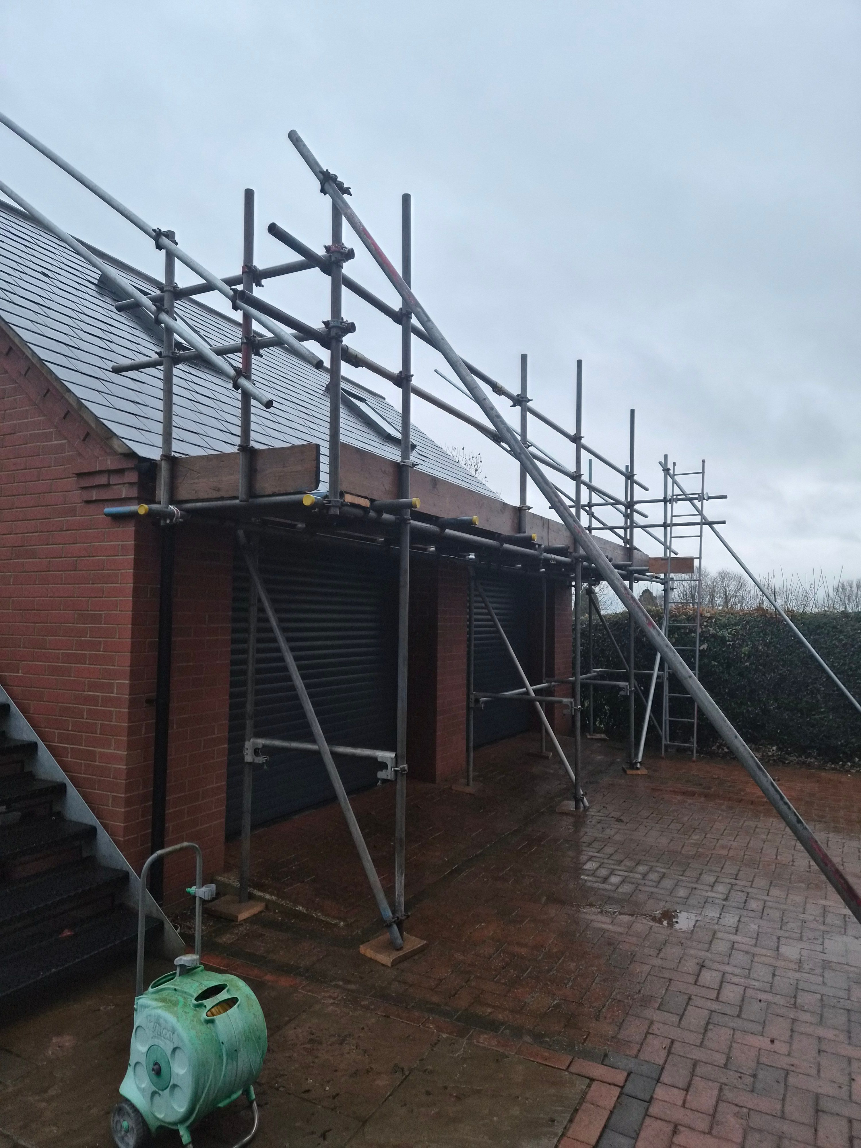 Monday, some hairy arsed scaffolders turned up and erected scaffolding on the garage.