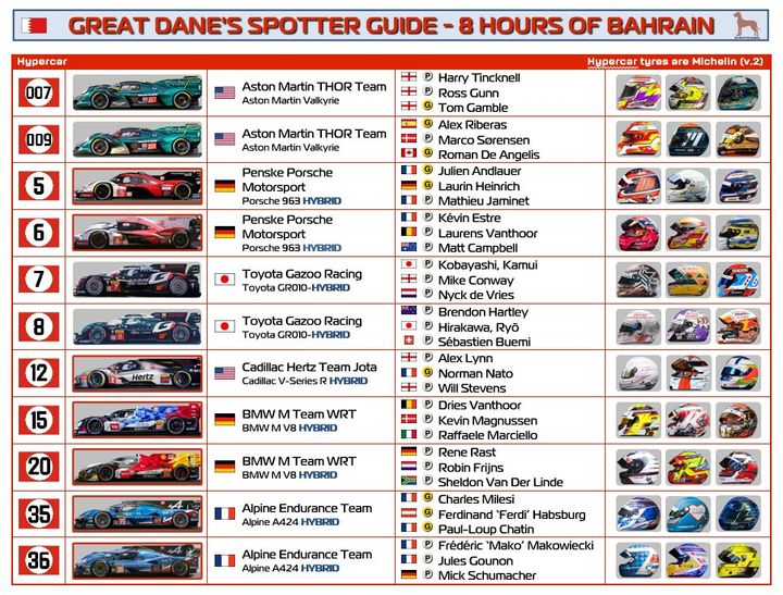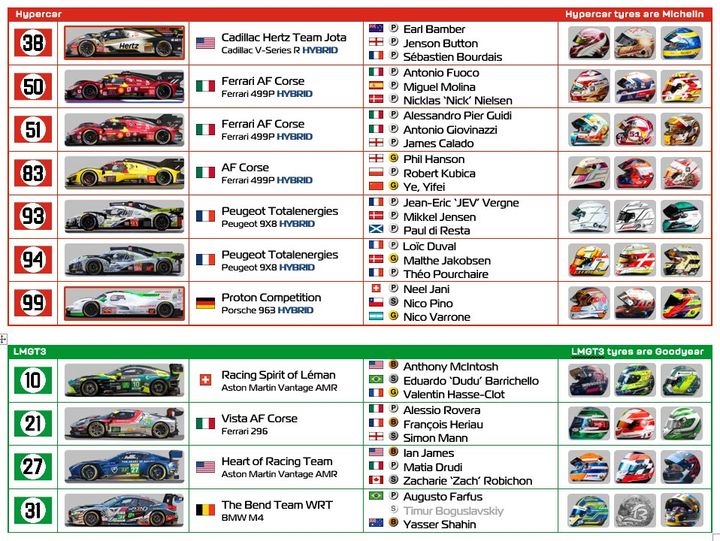 Hypercars, built to the LMDh regulations (Alpine, BMW, Cadillac and Porsche), have a red frame around the car picture.