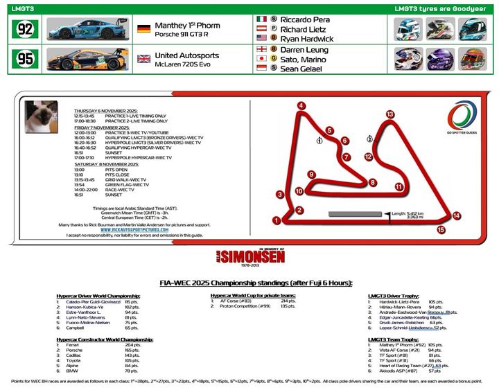 I have enclosed the current WEC Championship so you can check how the final Championship outcome might be. Bearing in mind that Niki Lauda won the Formula 1 Drivers’ Championship in 1984 by ½ point and that in 2021, Max Verstappen, controversially, secured his F1 championship on the last very lap.
