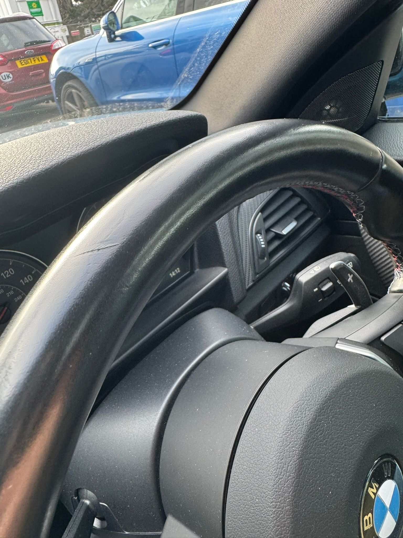 This morning I park up my car in the office car park, and lock it. Get in this afternoon and there is a lump on the steering wheel, it feels a bit like a bit of sticker or something, I just presume I have a bit of label or what not on my hand and try to pick it off... there is a cut on the leather of the wheel...