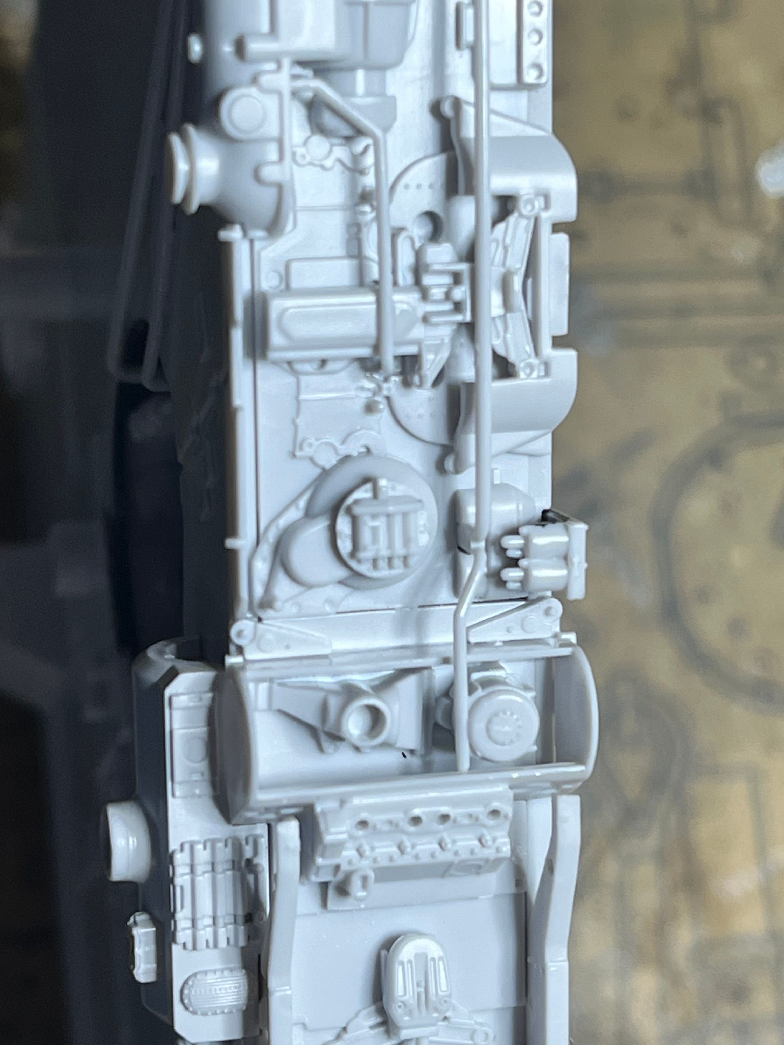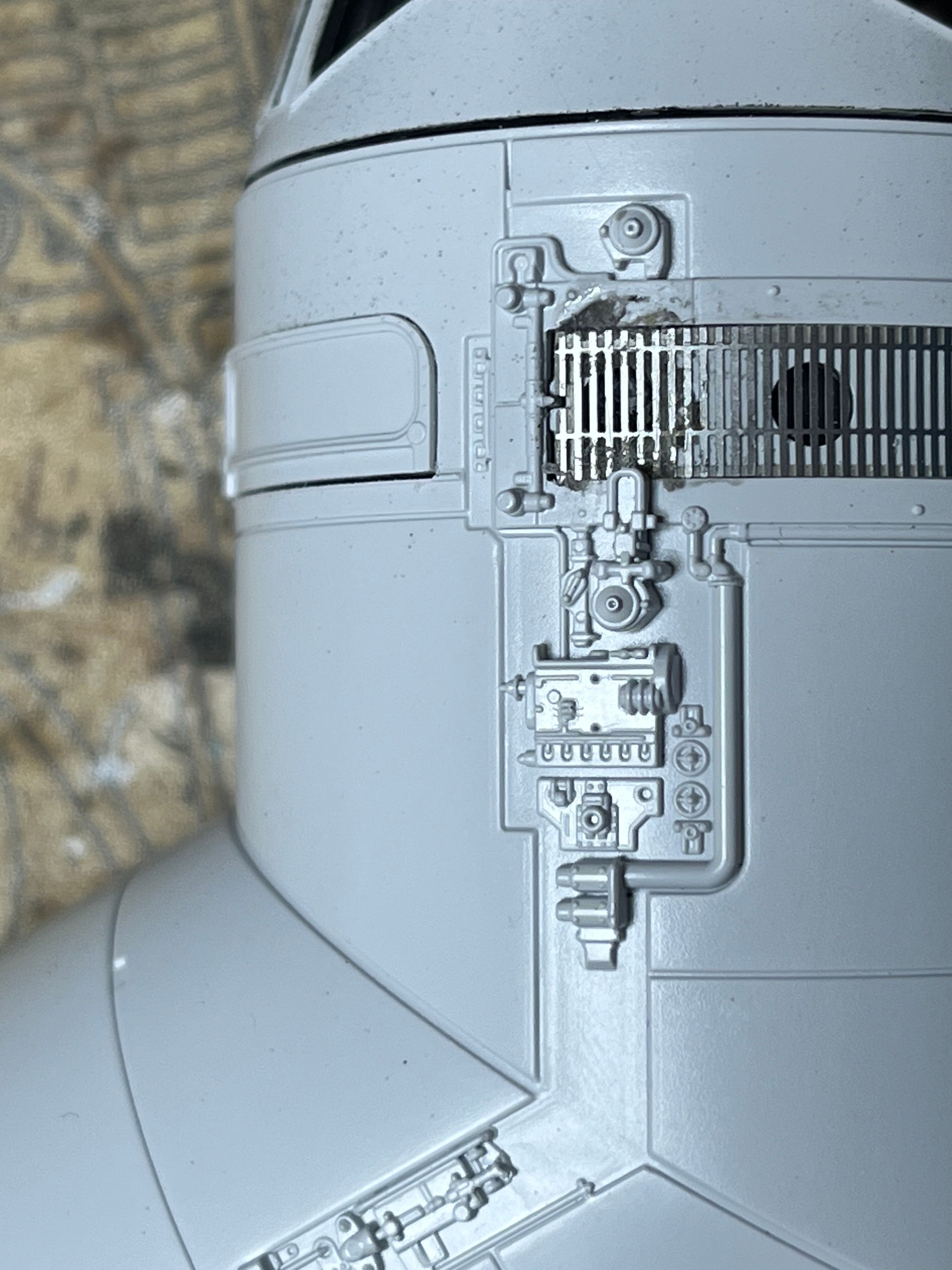 "Greeblies" are the random bits from plastic models that the model builders for the original film or TV series used to add visual interest to their creations. So you might see a suspension unit from a 1/72 Sherman tank or a turret from a 1/350 battleship alongside a gunners hatch from a 1/35 Tiger tank.The cockpit looks amazing.