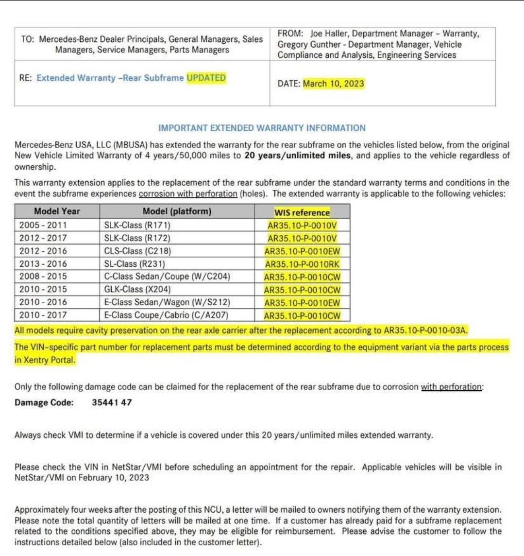 There's a letter in the new issue of the Merc Club magazine, where the writer says that a couple of months ago, he got the subframe replaced FOC on his W204 C-Class at a Vertu Merc dealer (Reading). And it would appear that this was on a car that had at least some of its servicing done at a specialist, rather than a dealer.