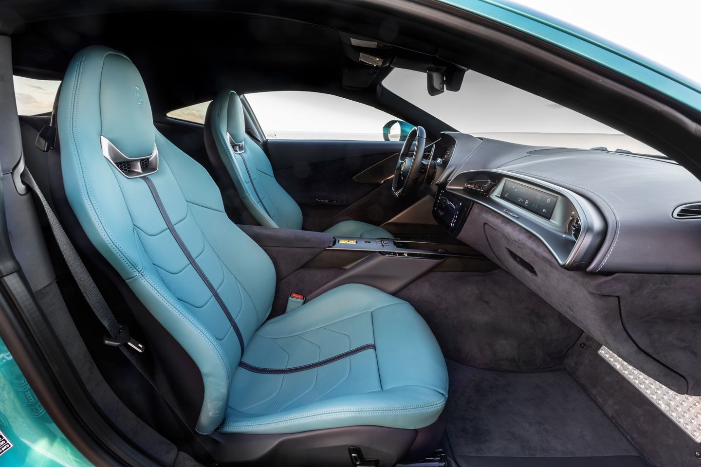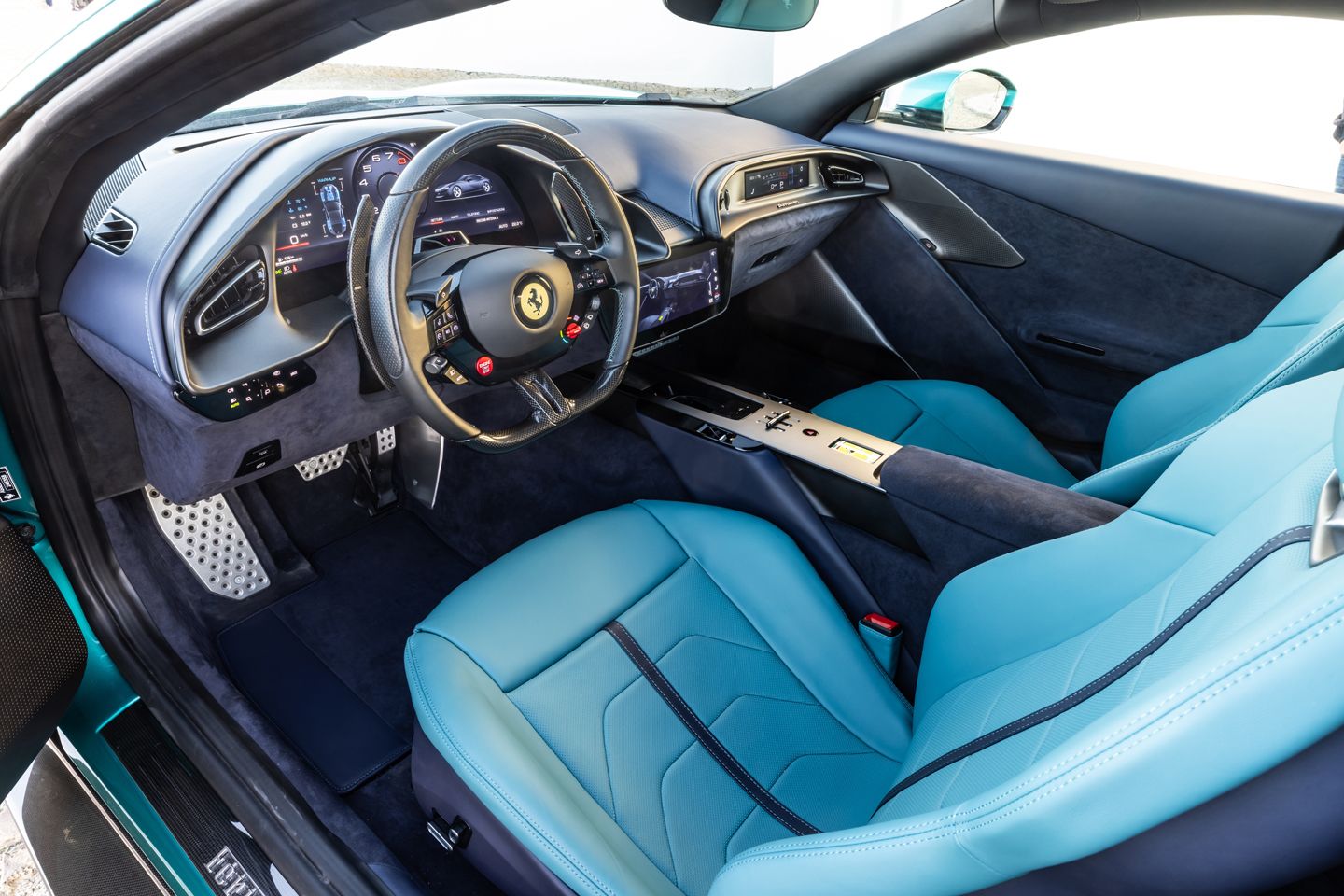 Underneath, there are new vortex generators to direct air towards six-piston Brembo brake calipers, controlled via a not insubstantial switch to brake-by-wire (BBW) tech, borrowed from the hybrid SF90. Ferrari says that this BBW tech, informed by 6D sensors across the car, allows for easier modulation without affecting brake feel. It does, if you’re wondering, retain a physical connection between the pedal and those carbon ceramics, which only takes control if there’s a system failure. But in normal operation, the system calculates what your braking input should equate to in terms of pad-to-disc pressure, and applies that in real-time.