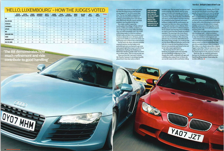 It was a great car, but it was my 4th Cayman and I felt like I had experienced all that it had to offer, and so fancied a change. The next logical step would have been a 911. However, the most formative years in terms of cars for me were probably the 2000s which I think was a golden time for performance cars. The cars that really interested me at that time were the sub £100k cars that straddled the sportscar/GT/supercar divide, as they seemed to be the best balance of driving enjoyment, desirability, usability and depreciation-assisted-attainability. The key players were the Porsche 911 (997), Aston V8 Vantage, Nissan GTR and Audi R8 V8. For some reason, it was always the R8 that I hankered after. I remember seeing one on the road for the first time, as it was getting dark, and it looked like some sort of alien craft being so low and wide and with its signature LED running lights. This desire was cemented when it convincingly won Autocar s Best Driver s Car contest in 2007, proving that it has the substance to match the style.