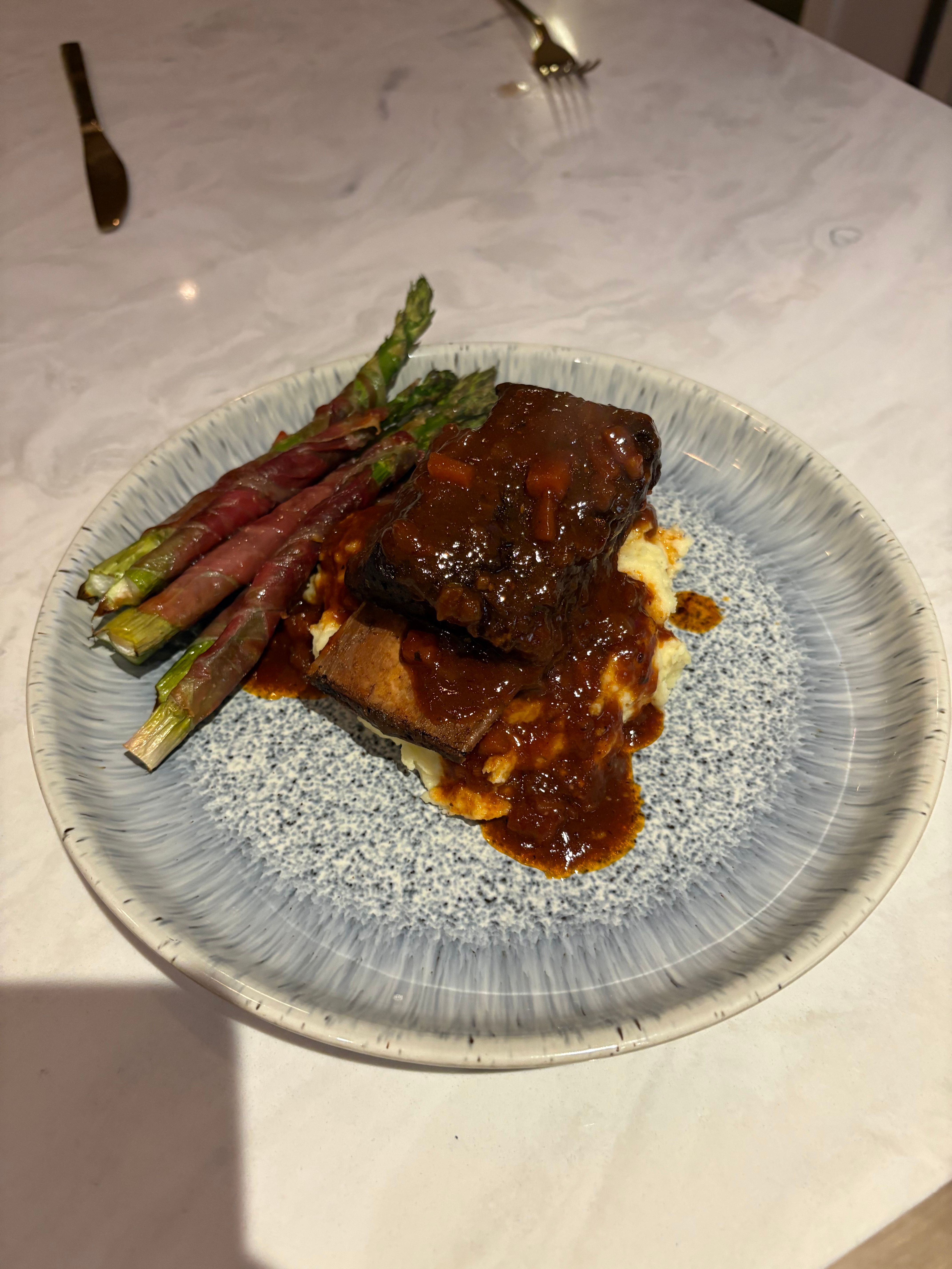 agreed this would be great. the main thing ime is spending a bit of time to ensure the ribs are properly browned as that really adds to the flavour. personally prefer to add chicken stock (with a smattering of rehydrated dried porcini mushrooms with the liquid used) tbh rather than beef stock as it's already (very) rich with the beef shortribs but that's just me. the ribs roast up really well as well though so it's quite flexible depending on what one fancies. enjoy OP anyway!