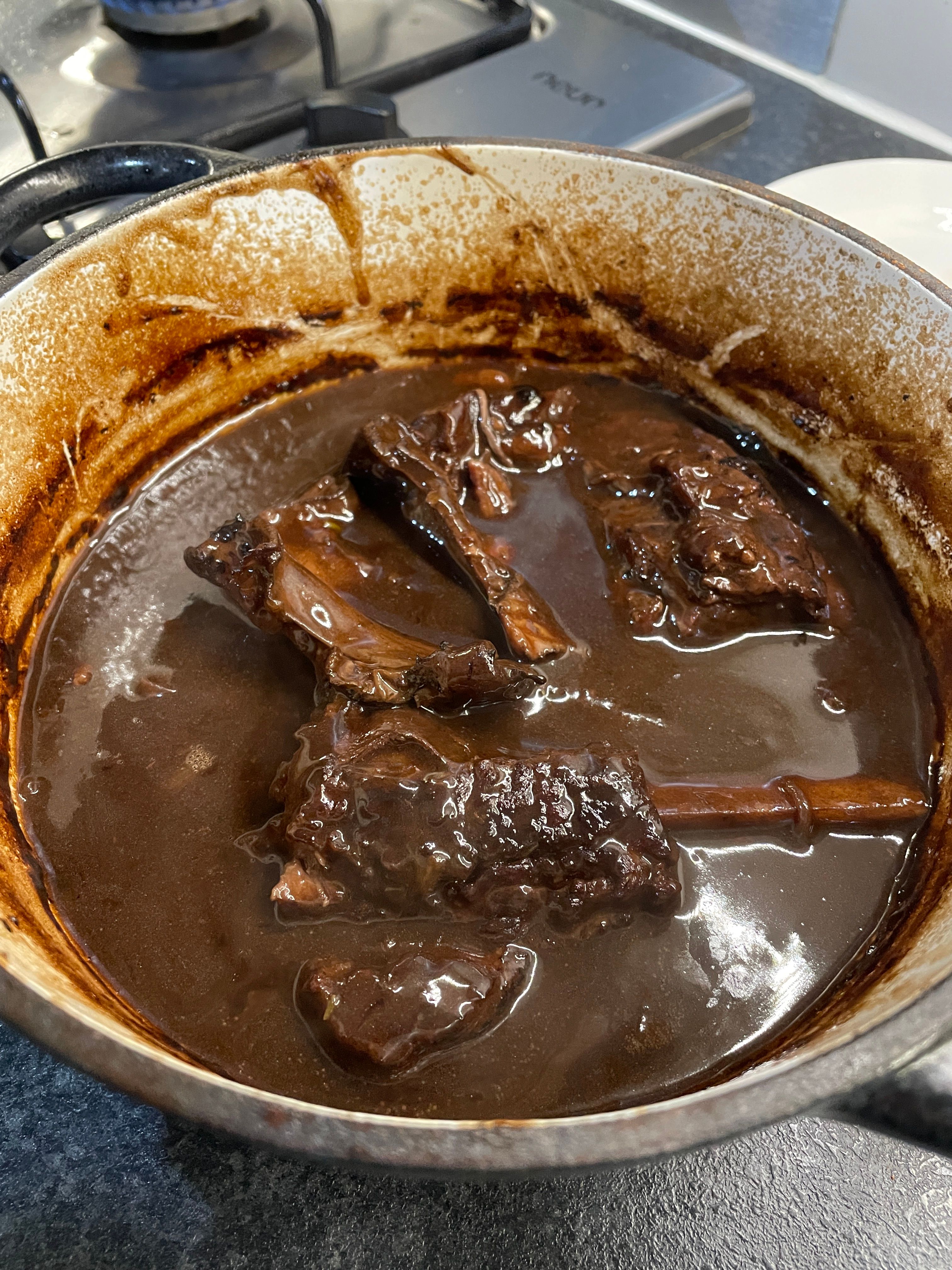 agreed this would be great. the main thing ime is spending a bit of time to ensure the ribs are properly browned as that really adds to the flavour. personally prefer to add chicken stock (with a smattering of rehydrated dried porcini mushrooms with the liquid used) tbh rather than beef stock as it's already (very) rich with the beef shortribs but that's just me. the ribs roast up really well as well though so it's quite flexible depending on what one fancies. enjoy OP anyway!Coat meat lightly in flour and brown in a pan slowly with oil