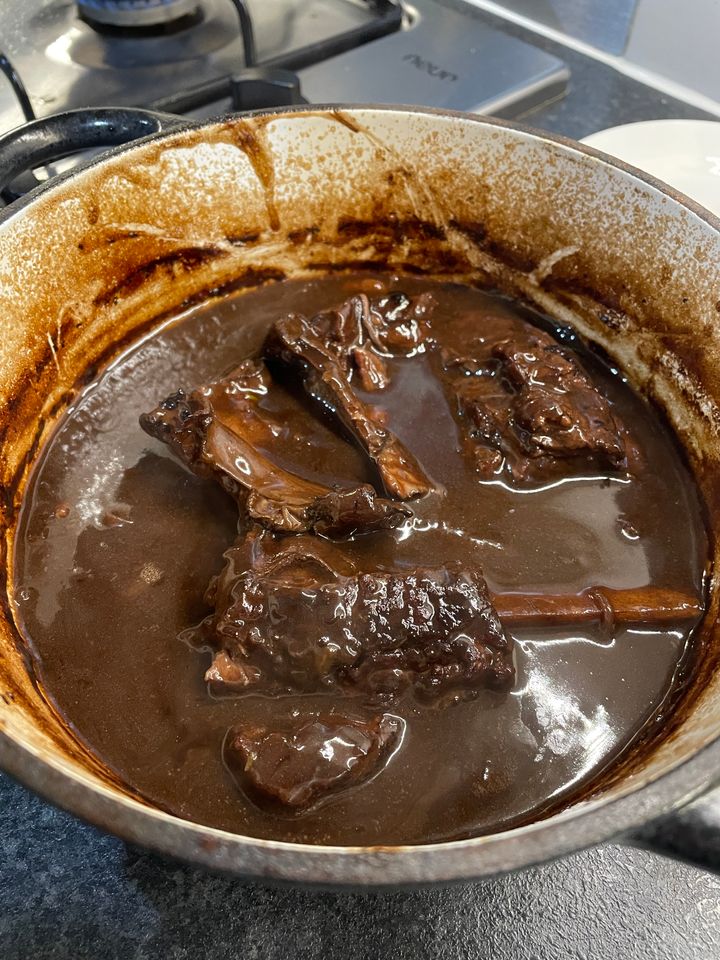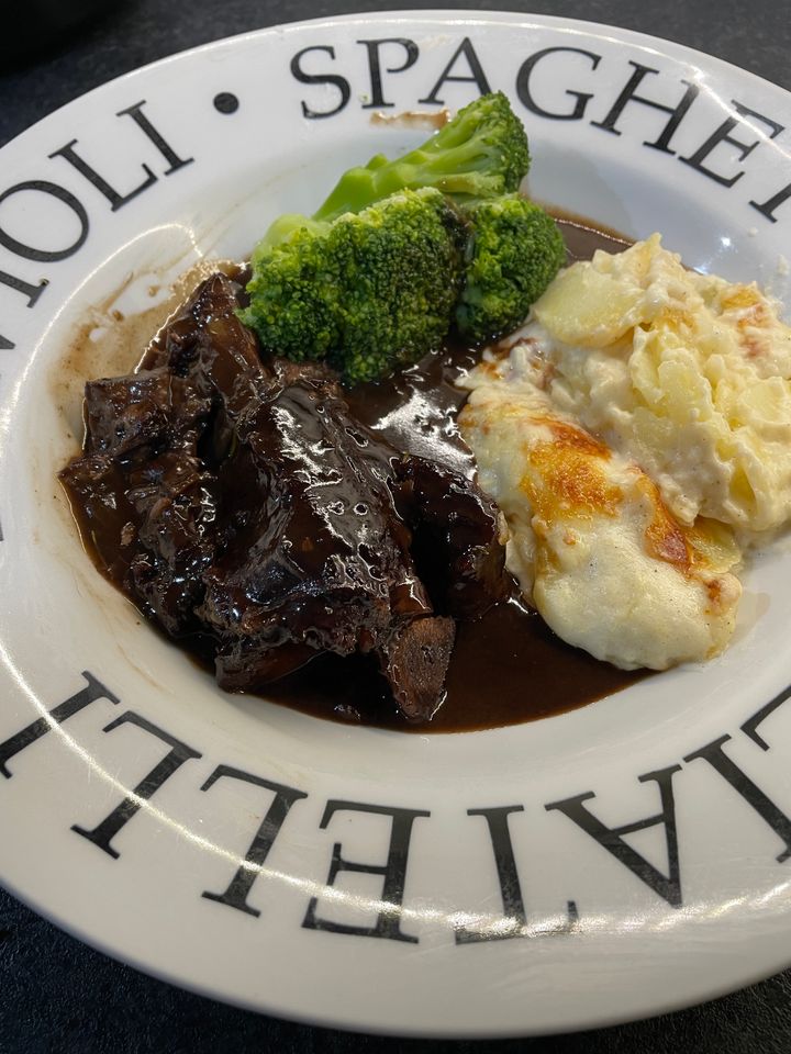 I did a Jacobs Ladder yesterday which had been in the freezer since last Christmas. I could not be arsed with faff so browned it off in a pan, poured in a bottle of red wine and a pint of stock made with two Oxo cubes and some fresh thyme. Covered in foil and in the oven at 150 for three hours. Took it out to rest covered for an hour and poured some of the liquid in to pan to reduce whilst I made some mash and steamed some veg. Was really nice for a simple rustle up. The meat was lovely and tender. The only pic I remembered to take however was while browning it off so you'll have to take my word for it.