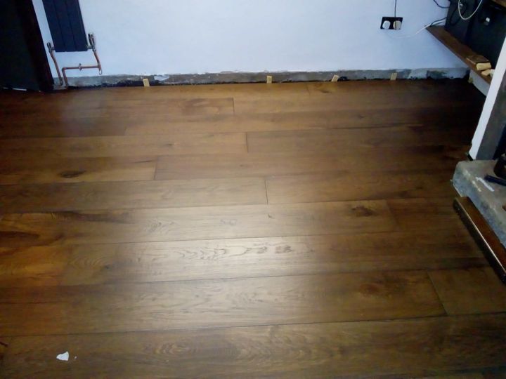 That's the floor down. A bit of floor grinding, a bit of self leveling. A week to let that dry. A day to lay the underlay. 2 days to dry fit the boards. Just over a day to glue up.
