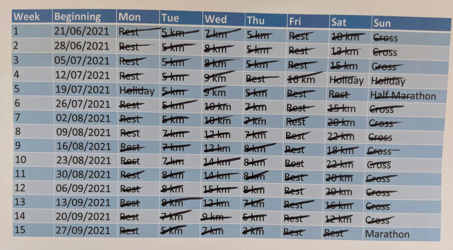 A few years ago I set myself the goal of rowing along with the London marathon while it was on TV. I found a training plan which I printed off and stuck to the kitchen wall. Ticking off each activity was very addictive to the point this scrappy bit of A4 is now a treasured possession. My "cross" training was typically cycling.