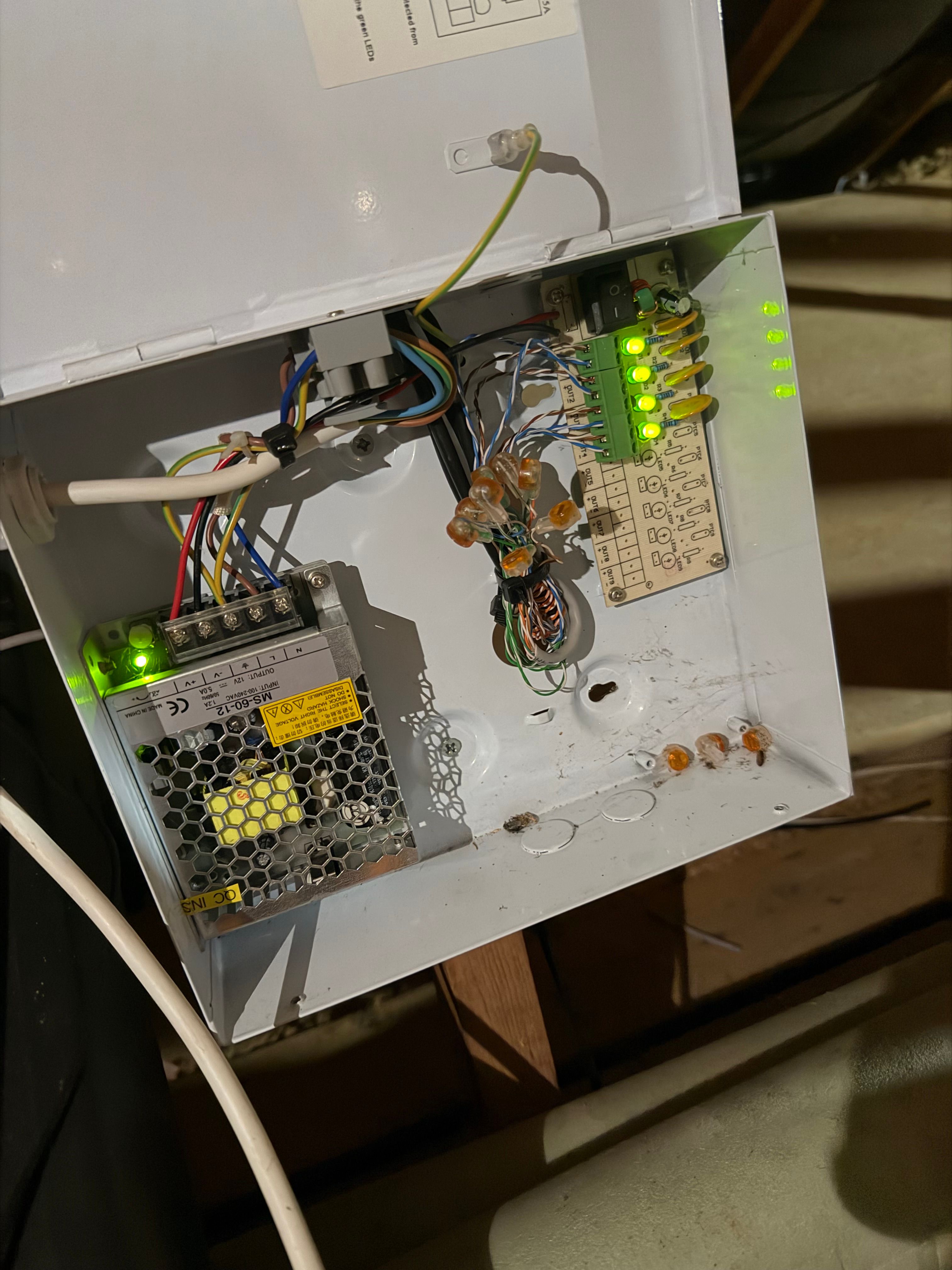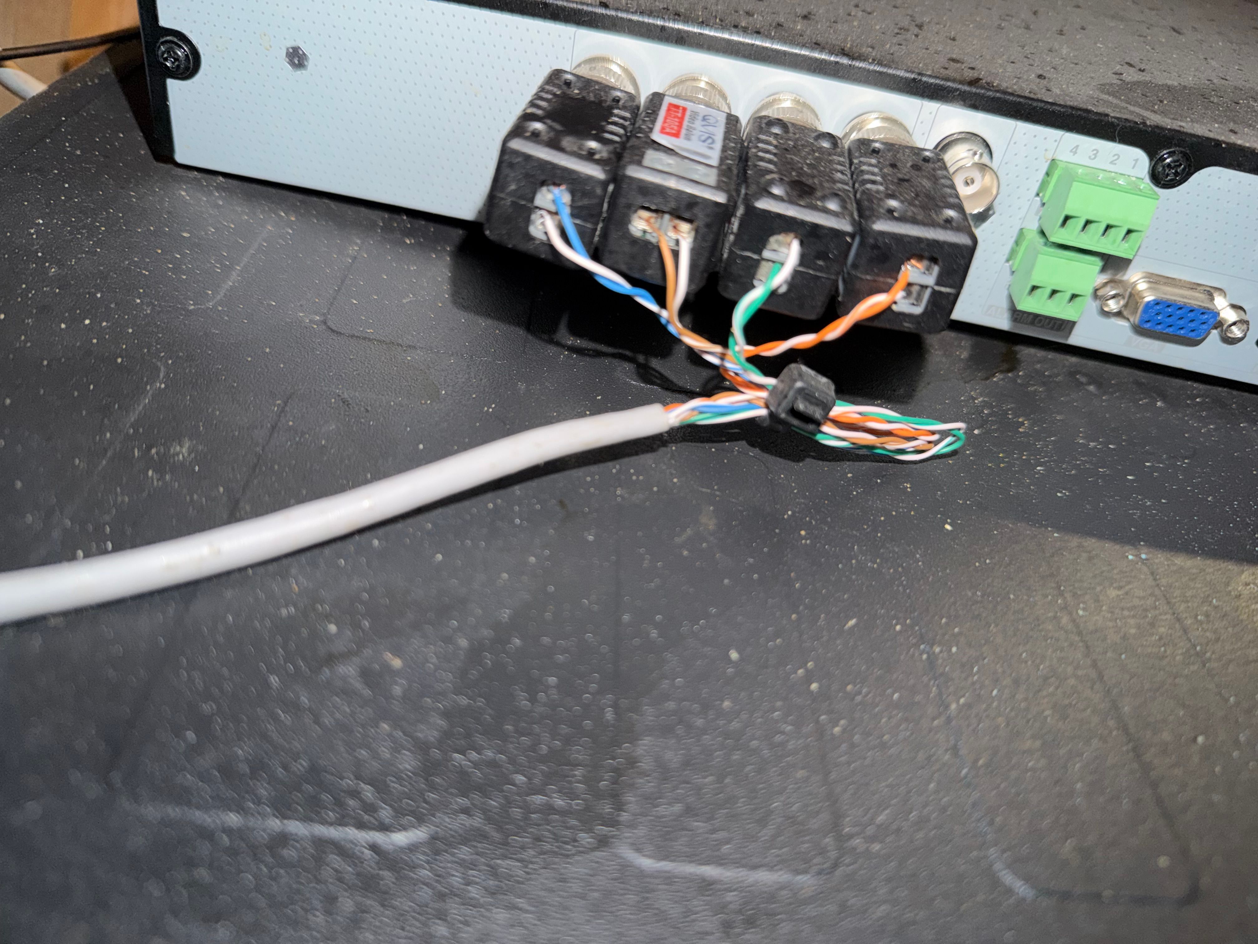Also, if you look inside the power supply box you can see the other end of the grey 'video' cat5 cable, they have used jelly crimps to connect it to the black CAT5 cables that run to each camera.
