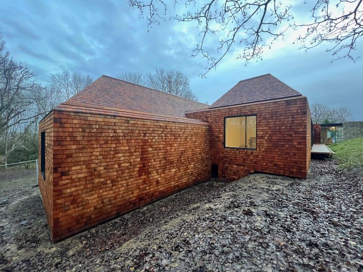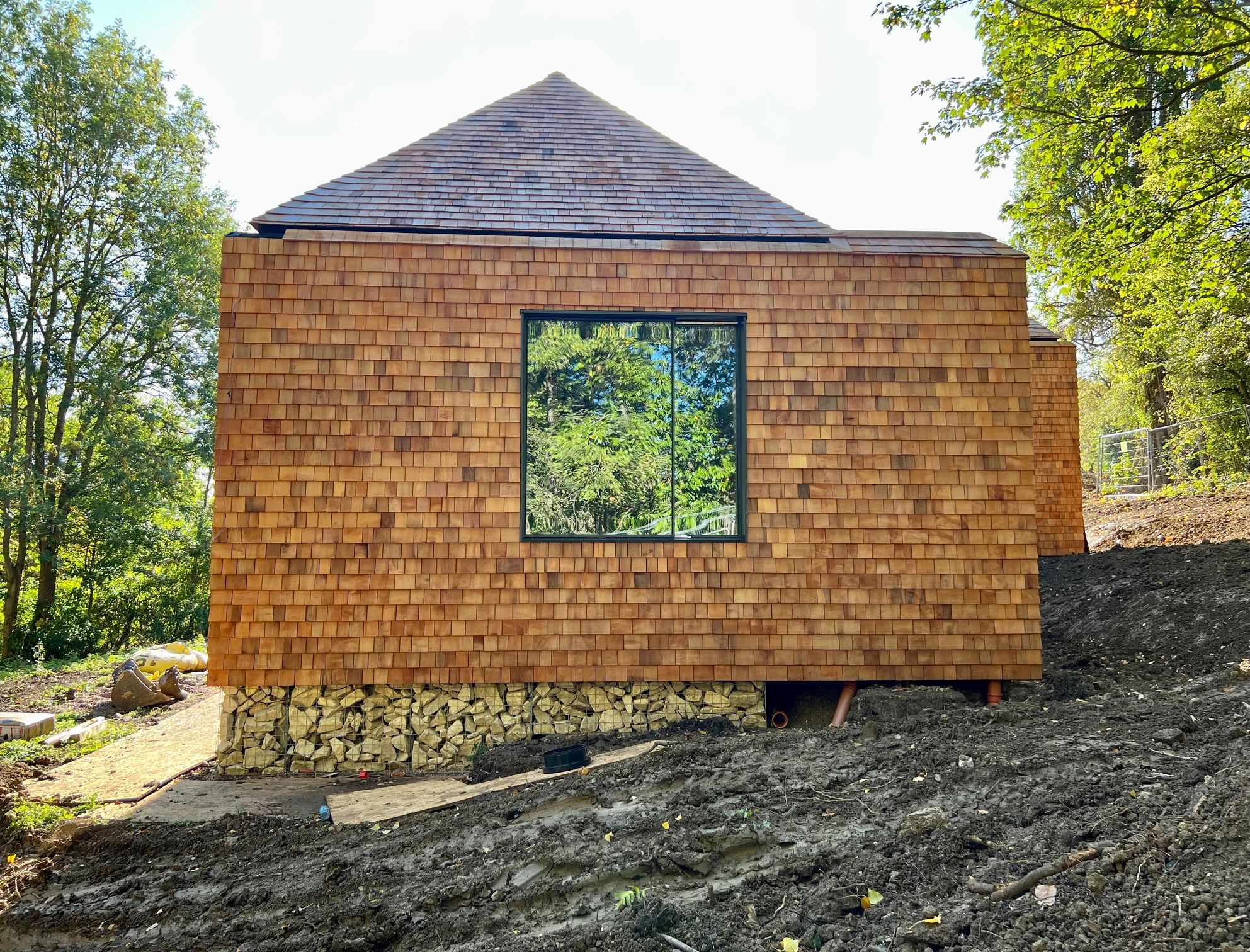 Project is clad in cedar shingles (wall and roof - planning requirement) and, whilst it might not be everyone's taste, it does have the effect for its 'wooland' location.