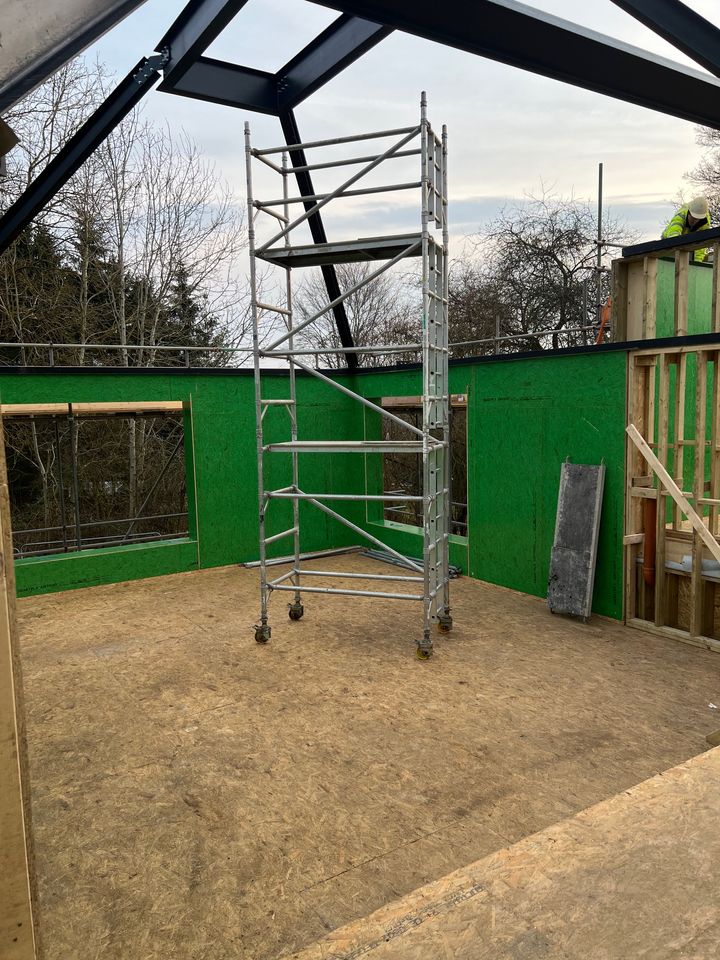 The project has ground screw foundations and Modcell panels, costs wise it is initially slightly more expensive than masonry, but when you factor in timescales (walls and roof were all on within a week), lack of 'mess', labour, weather, skips, etc. the contractor/developer has said there is no real difference and would happily use it again.