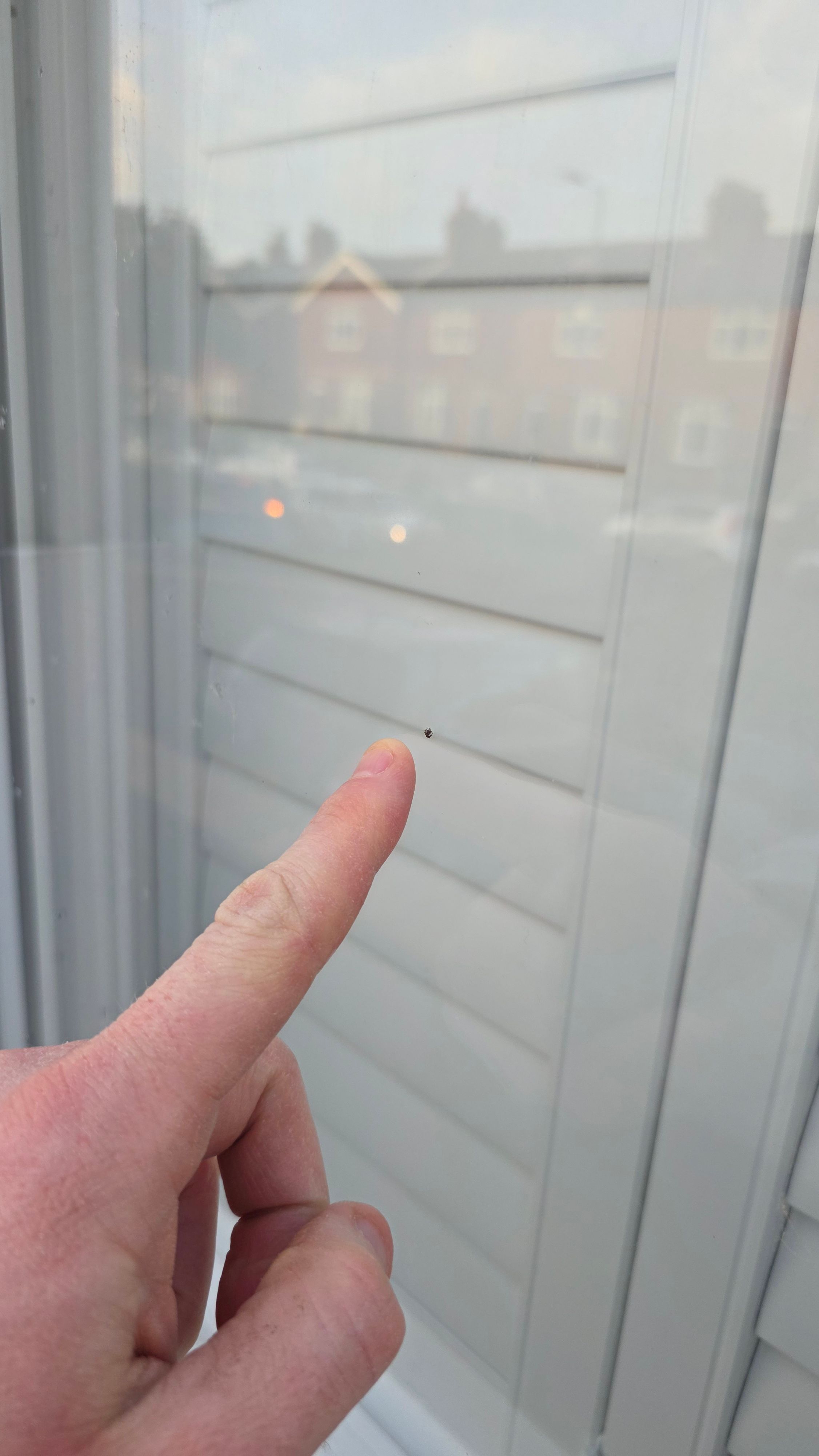 Probably a couple of mm but right at eyeline in the year old window by my front door so it has aggrieved me a little.