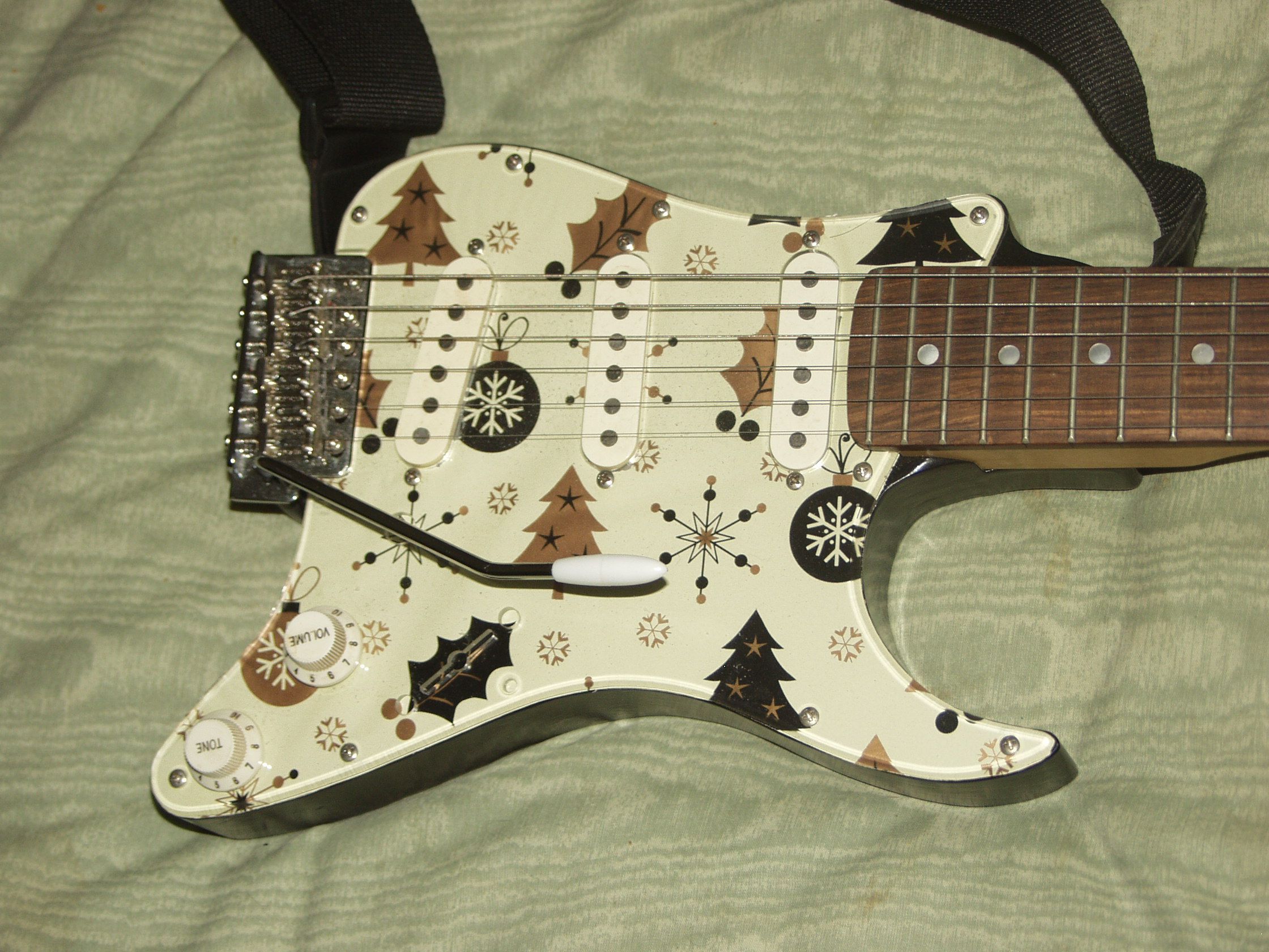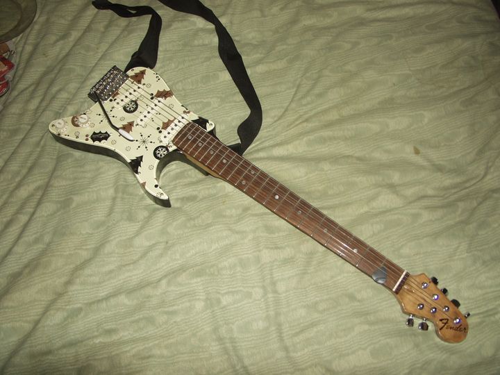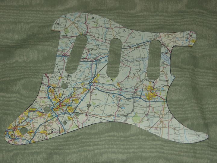 Finally I bought a clear scratchplate for it, so I can now put anything I like behind it, and that becomes the colour scheme. Since then I've upgraded a few of the components and am about to convert it to Brian May wiring. Total cost including the original guitar and labour, £161. Do need to upgrade the tuners though as they're a bit cheap and nasty. Have some Klusons from a Les Paul in the spares box, they might look nice.