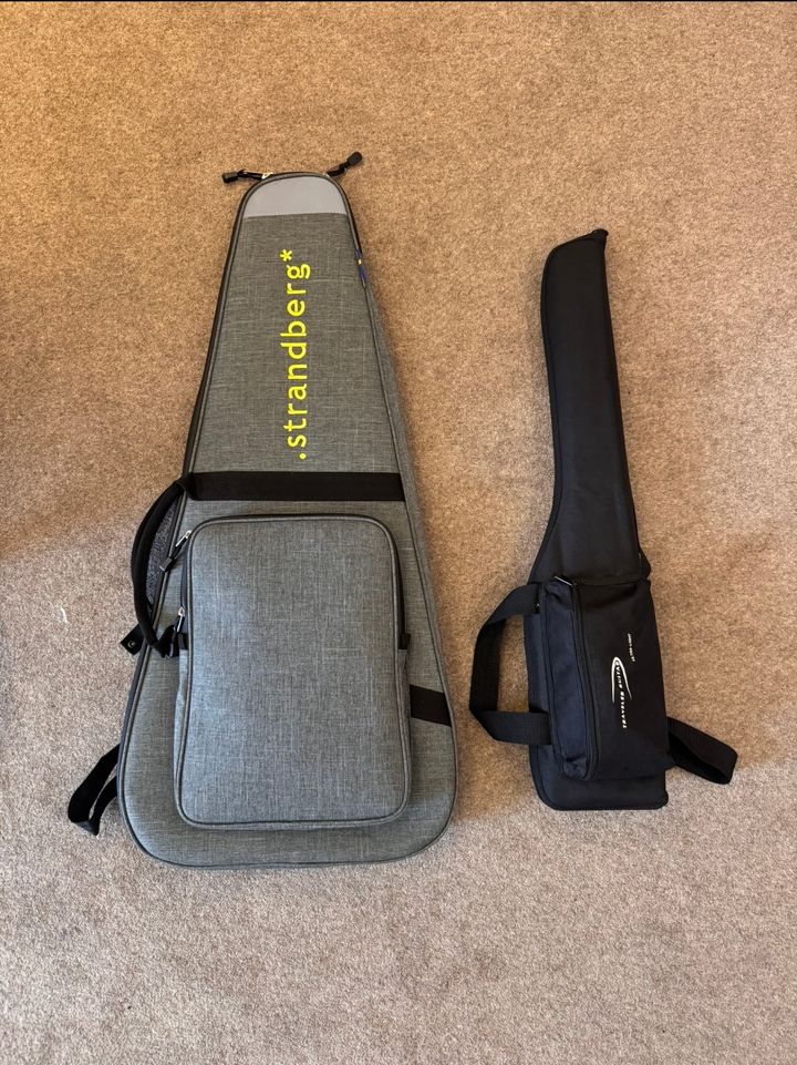 The Strandberg is definitely bigger, including when packed (although still small in general guitar terms and very portable) but better made and feels like (is!) a real guitar. I could (and do) play it as an everyday guitar because it's so ergonomic, whereas in contrast I rarely play the Traveller (and only ever when I'm away) because it's not that comfortable; now I have both I'll probably end up selling the Traveller as I rarely fly for work these days.