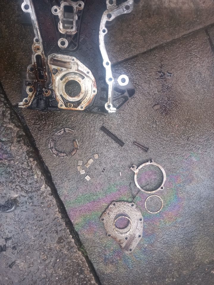Edit to add the outer ring of the oil pump that doesn't look broken actually is broken, a piece around 1cm broke out of it but I placed it back in the position it snapped out of before taking the pic when I was checking to make sure all the broken pieces were accounted for (and were not pushed up into an oil gallery etc).