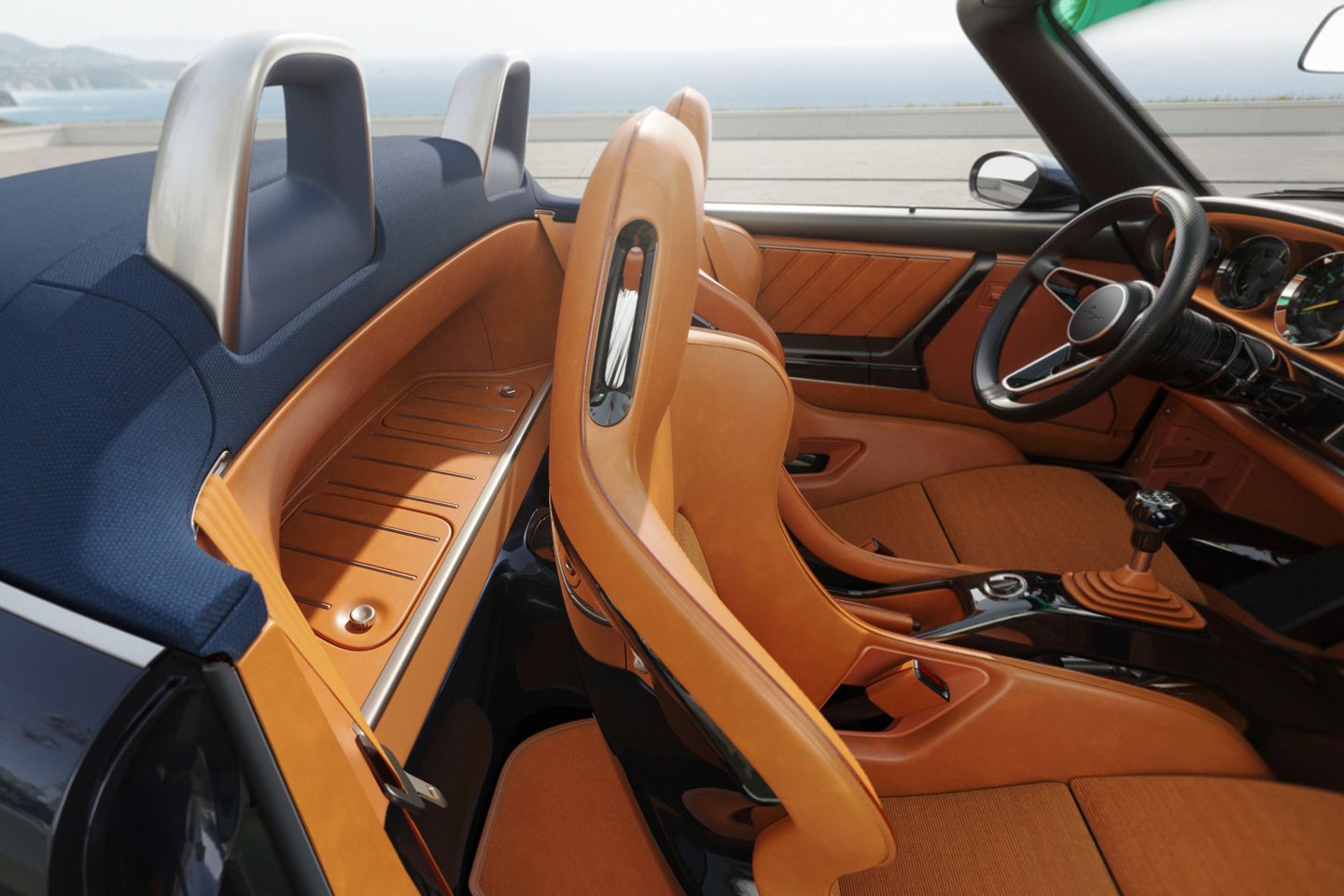 Roof down provides an even better look at the redone interior, with a new look for the familiar five dials, leather and carbon throughout plus a very cool exposed mechanism for the manual. The cars seen here feature a Tangerine interior with stitched and burnished leather seams plus sports seats with velvet corduroy centres, then an Ink interior with the same seams, ‘Inteferenza’ cloth and the track seats. Whatever the customer wishes for the inside, Singer will make happen.