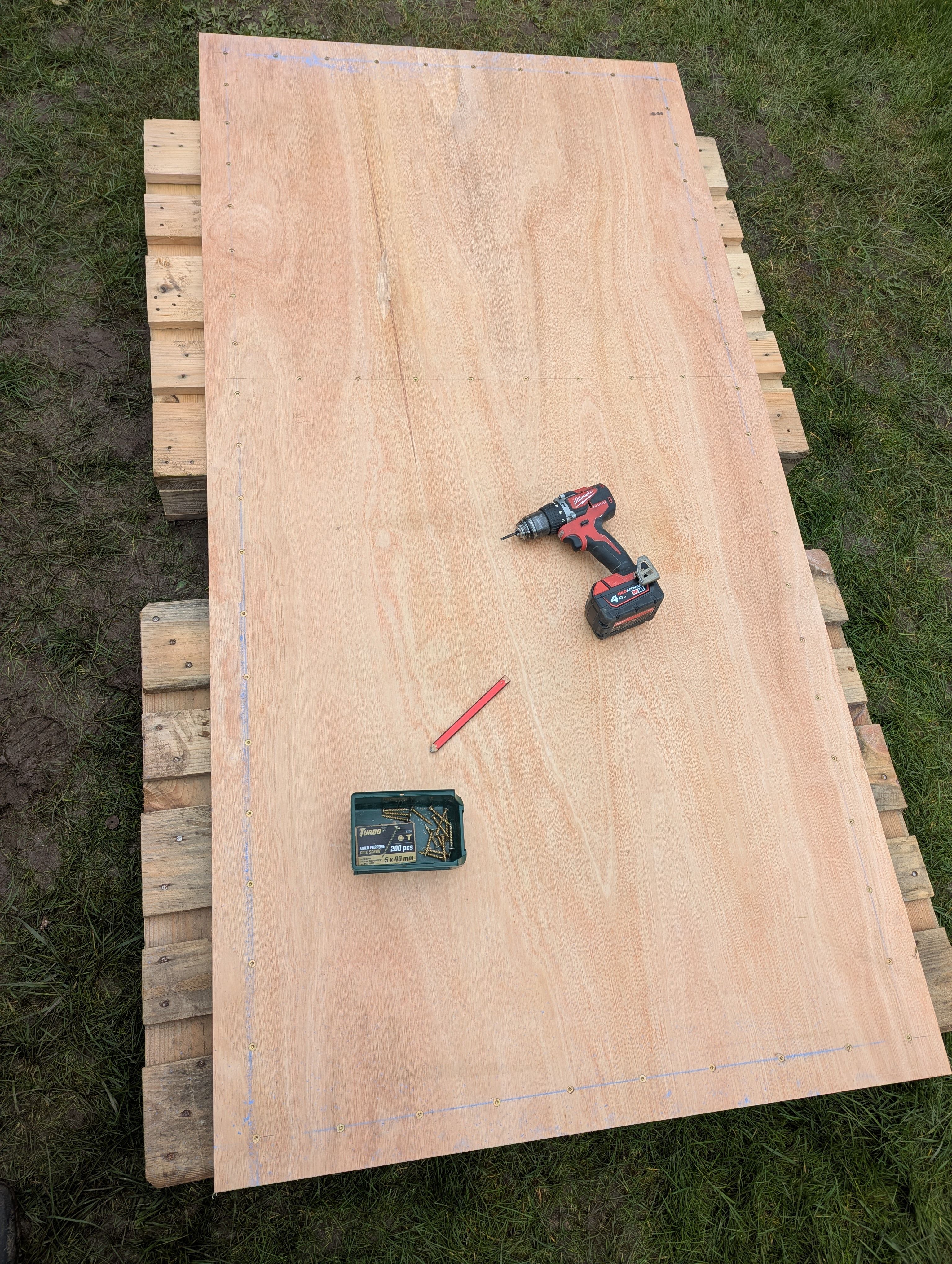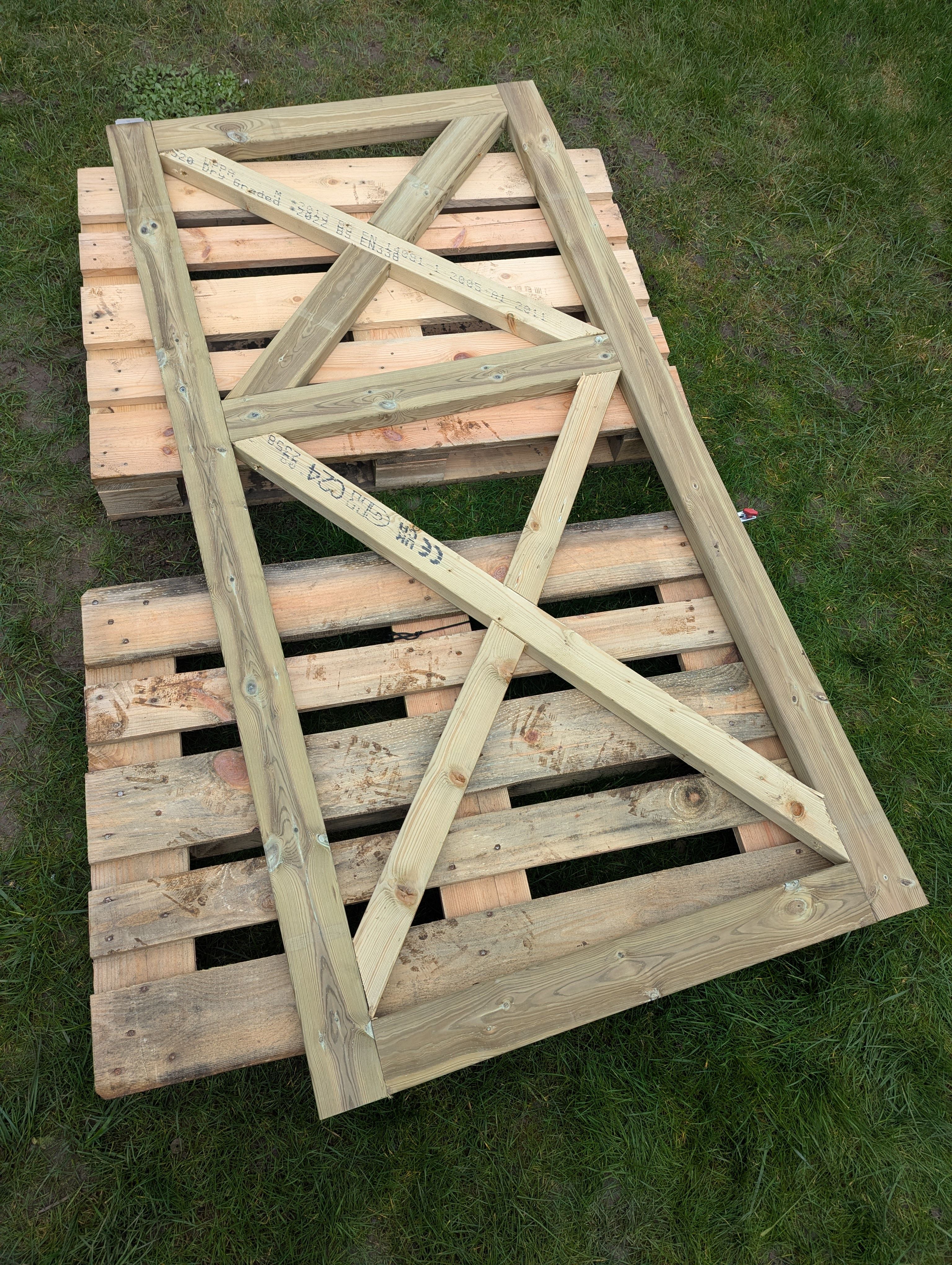 Obviously I ignored that, threw a couple of pallets onto the grass and then threw together a frame. I did use a set square though and squinted at it for a bit.
