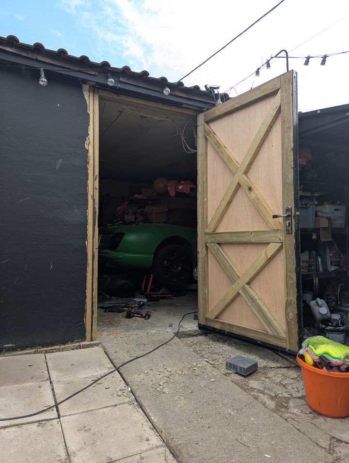 I thought that I would make the door first so that I didn't have a big gaping hole in my garage overnight. I made the door and then measured the width that I needed to cut from what I thought was the blocks on the bit of wall that was staying.