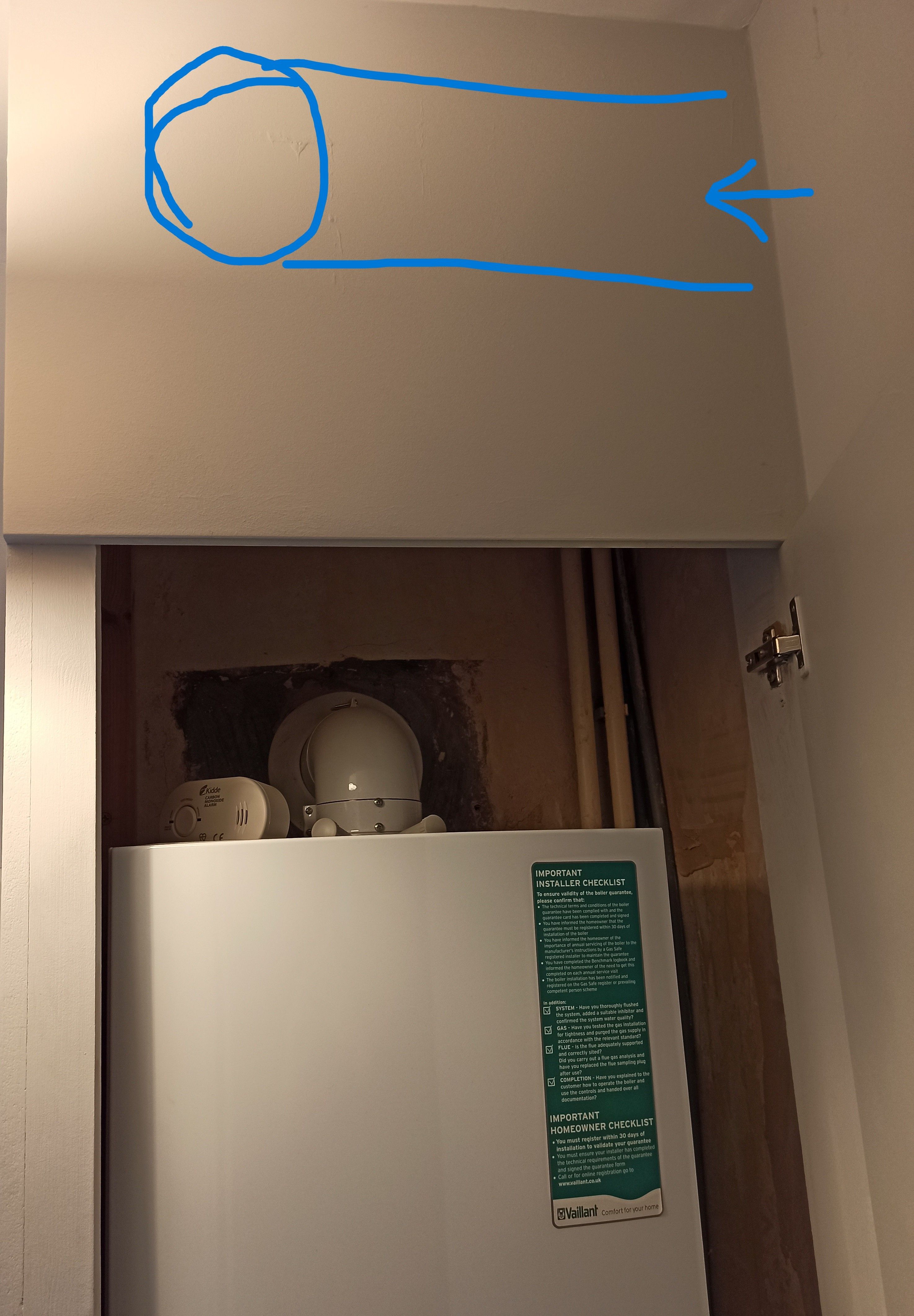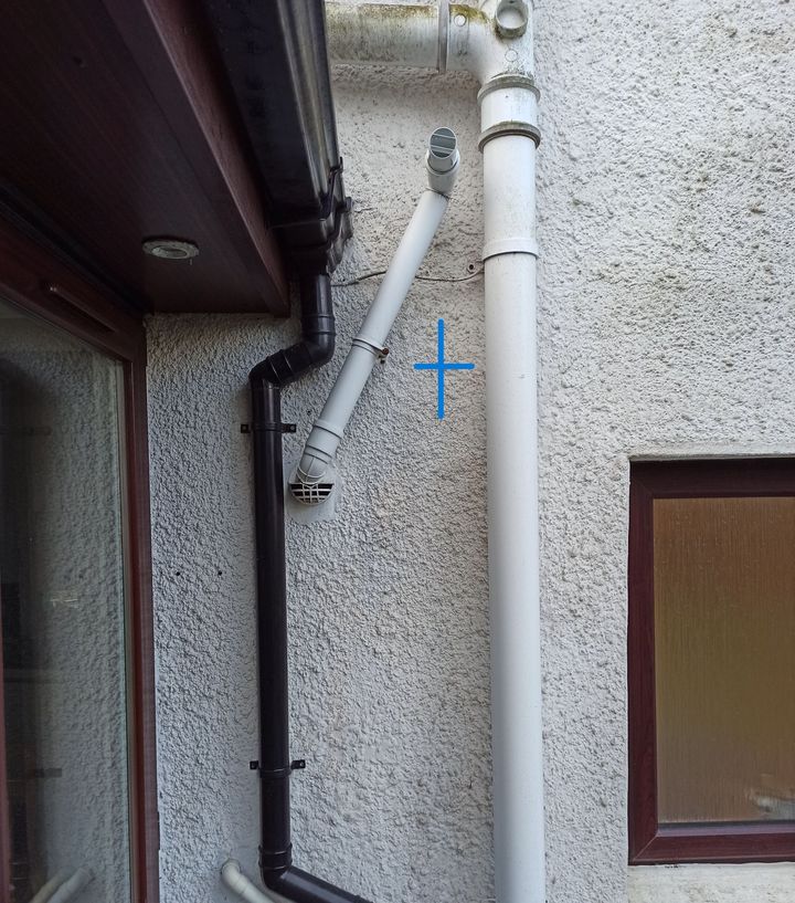 Outside is also cluttered. The cross is approx where it would exit which should be 300mm away from the boiler flue.