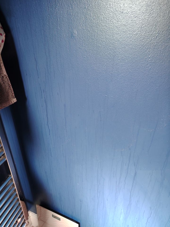 Has anyone encountered this before? It's a Dulux bathroom paint but if it gets water splashes on it then it's stains and won't clean off or dry.. What did I do wrong, and how do I fix it?