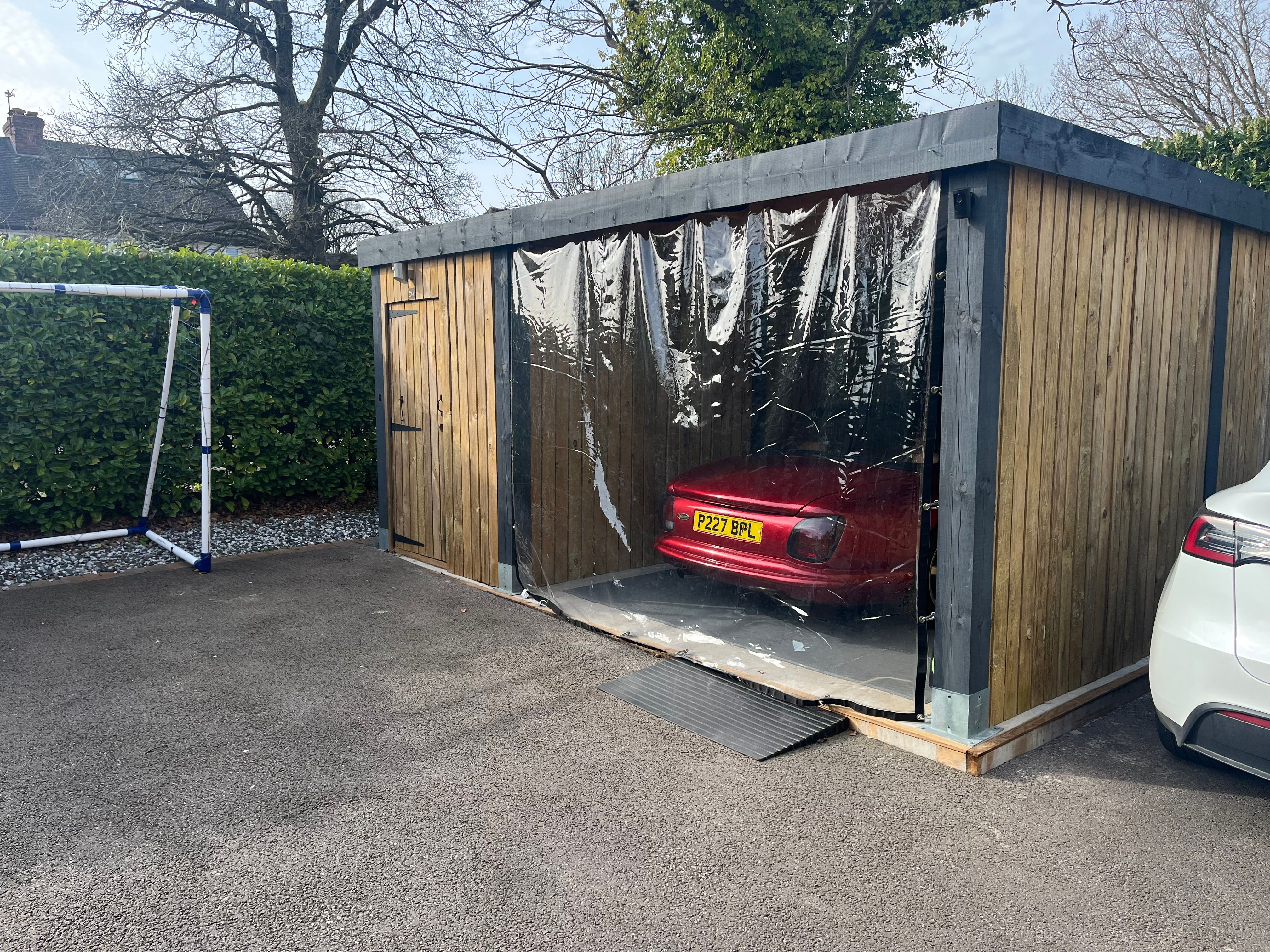 I have a weekend car (TVR Chimaera, referencing as not metal bodywork) that is kept under a carport/garage space, enclosed at either end by large plastic screens which maintain a nice flow of air around and under the vehicle... Crap description... see below