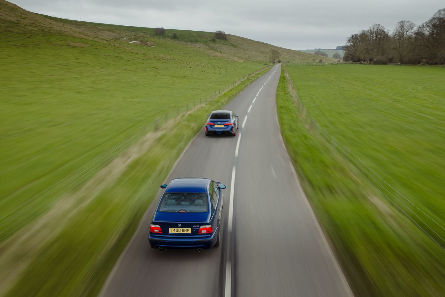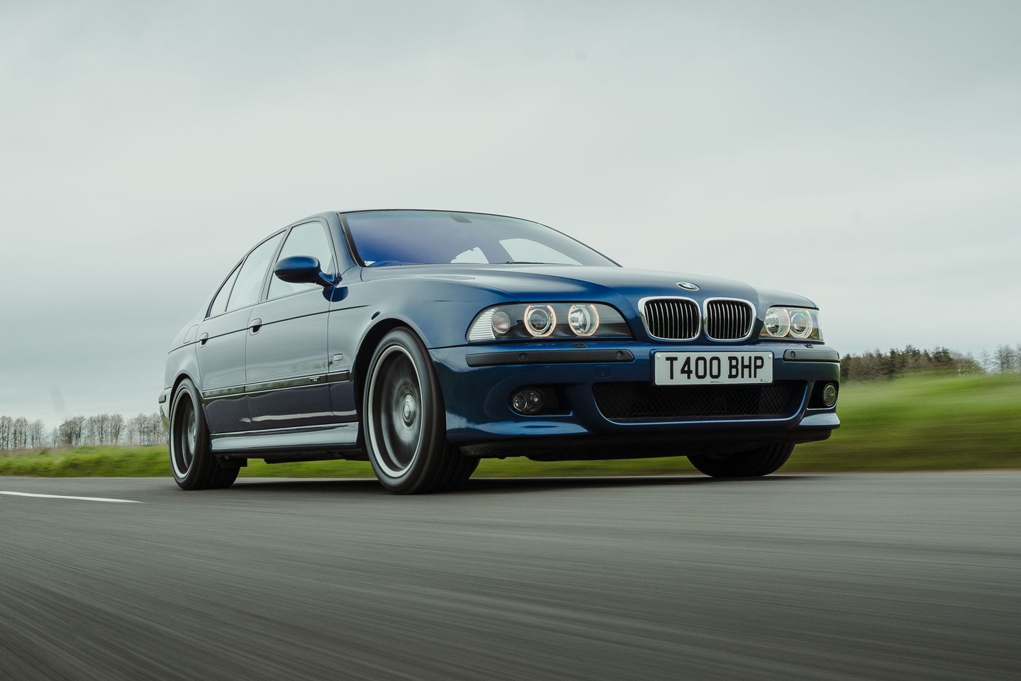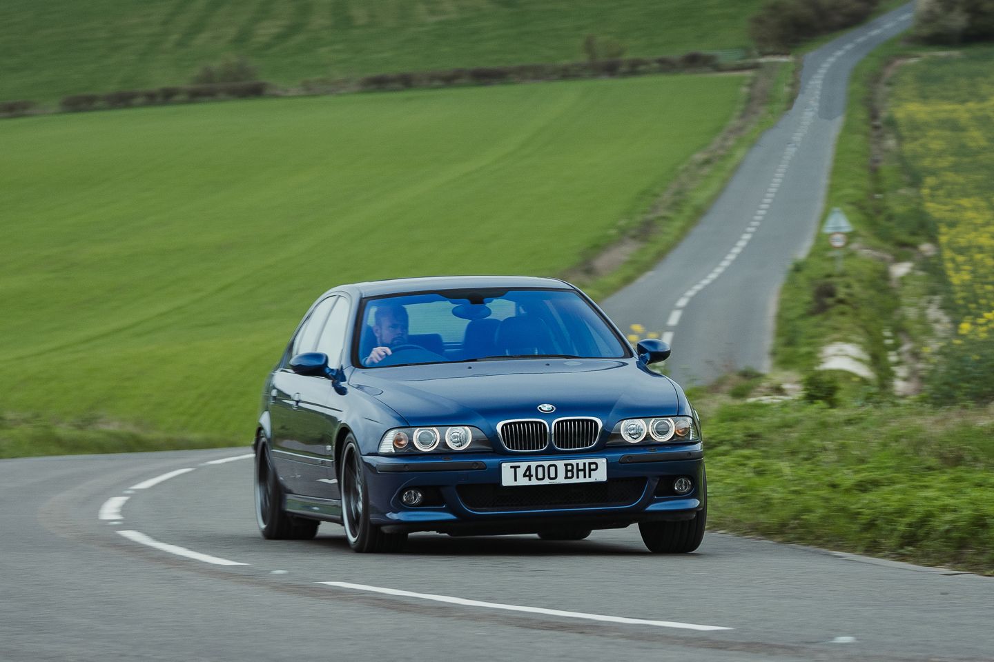 Hope is handed to the G90 by the wonderful work of the BMW UK press office, who’ve had the brilliant idea to specify this example in the same Le Mans blue as their beautifully kept heritage E39. Even the most curmudgeonly cynic has to concede this is a great-looking pair, the latest M5 a bit less burly without an estate body and wearing this blue on silver getup. The low-key menace and unmistakably early noughties angel-eye lights of the E39 still quietly upstage it, yet these two complement each other magnificently in the metal.