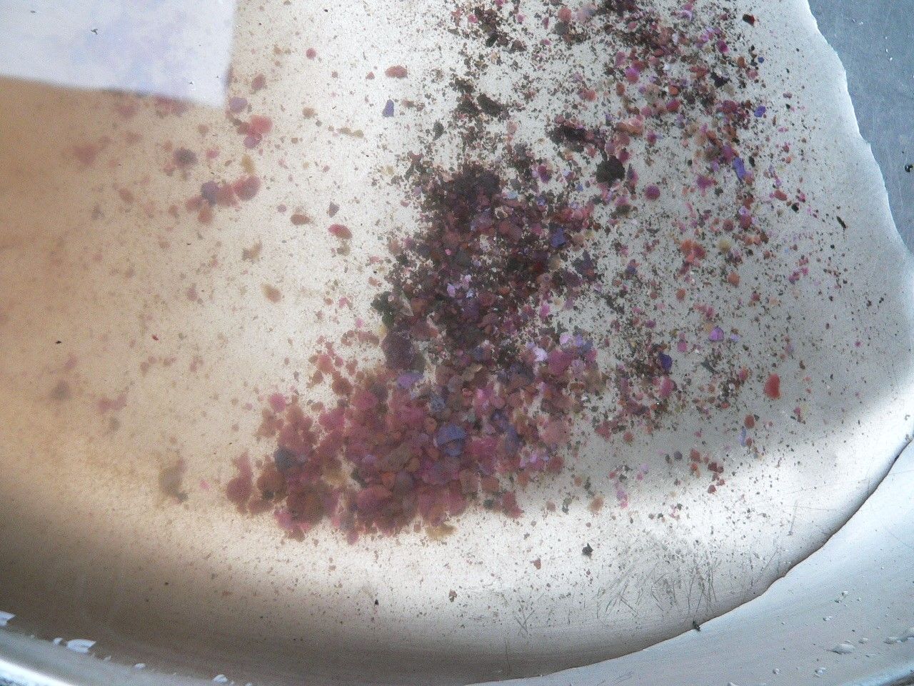 I've just recently bought an old jag, and noted the antifreeze was a very light pink colour (HOAT) whereas on this age of car it should be blue (IAT), However it was clear of brown sludge. And so, I drained the pink out (removing the bottom hose) and flushed the radiator out with the garden hose. In doing so., I noted unusual (to me) mix of bits in the catch tray .. pink, blue and dark coloured particles (the latter of which were probably rust from the old cast-iron block). I took a photo which I'll try to upload . . .