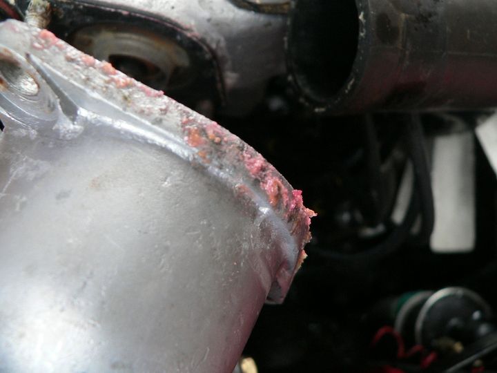 I've also noted the thermostat's gasket face is corroded away. . .Being the new owner-mechanic I don't know whether that corrosion is related, but the gasket face now needs redressing smooth and flat.