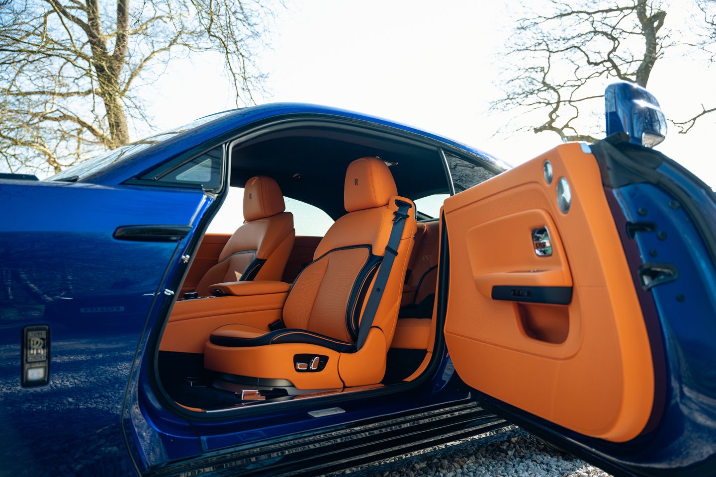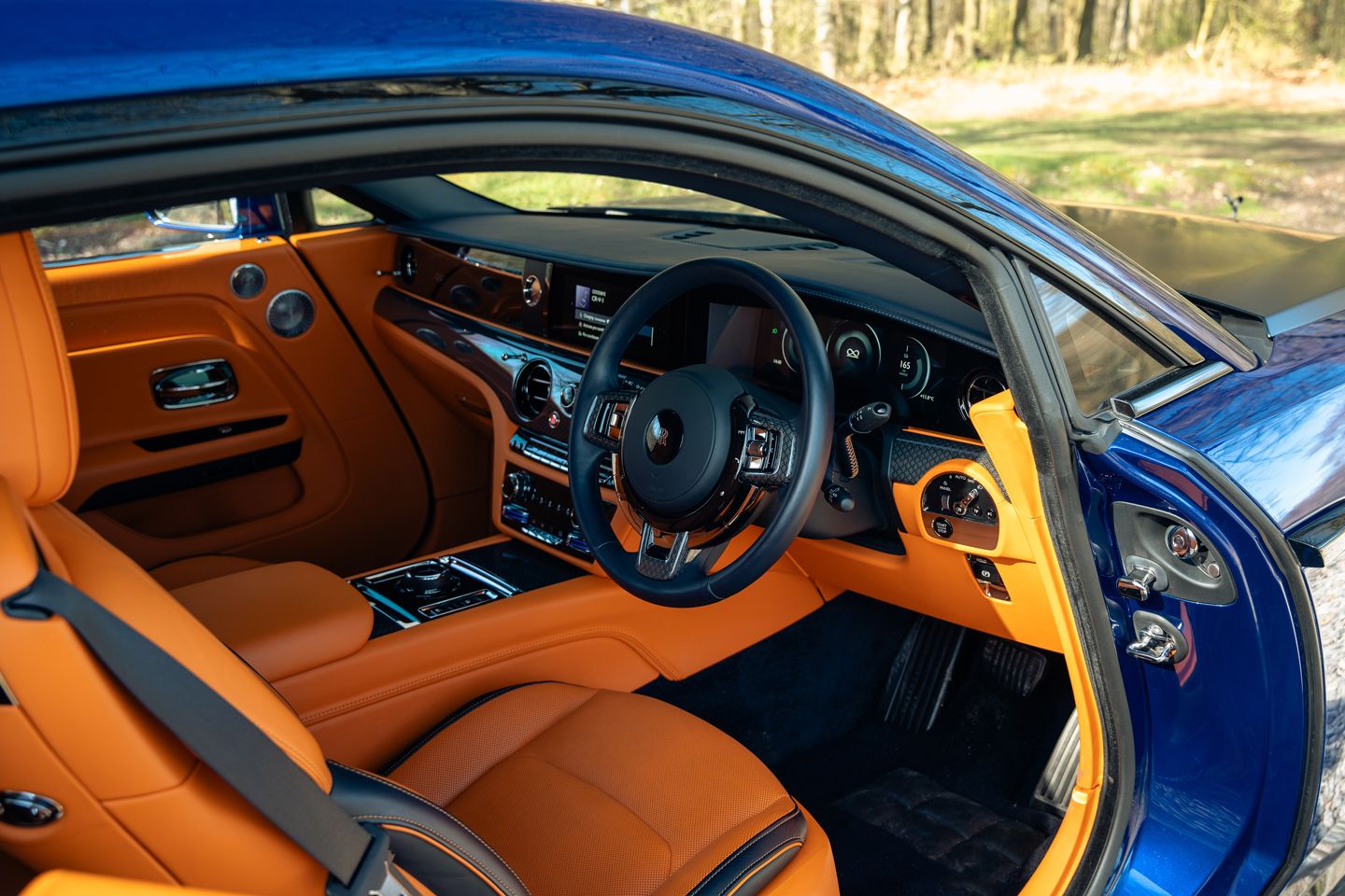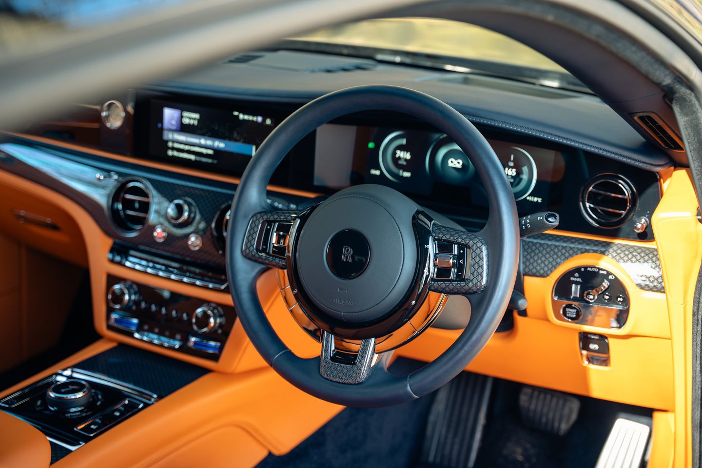 You can loosen and even extinguish its DSC without feeling in any more peril, the wide rubber of these larger, Black Badge-special 23-inch wheels working with its finely calibrated power delivery to keep things neat ‘n’ tidy. What we wouldn’t give for the long, tree-lined driveways of the estate its target owners surely inhabit to nudge closer to the extremes of its behaviour. Happily, it gives you Rolls-appropriate levels of interaction and joy at all speeds, its augmented, digitised sound being pleasingly classy and making it feel more mischievous than even a V12-equipped Black Badge. The dark, alter-ego vibe of the whole affair feels even more fitting on a fully electrified coupe; a car of contrasts and contradictions that all come together regardless. The interior is – naturally – a triumph, even in lurid orange. The Black Badge play for younger buyers is evidenced by its darkened clockface and a host of materials less rooted in the traditional. Good luck finding any chrome or wood here.