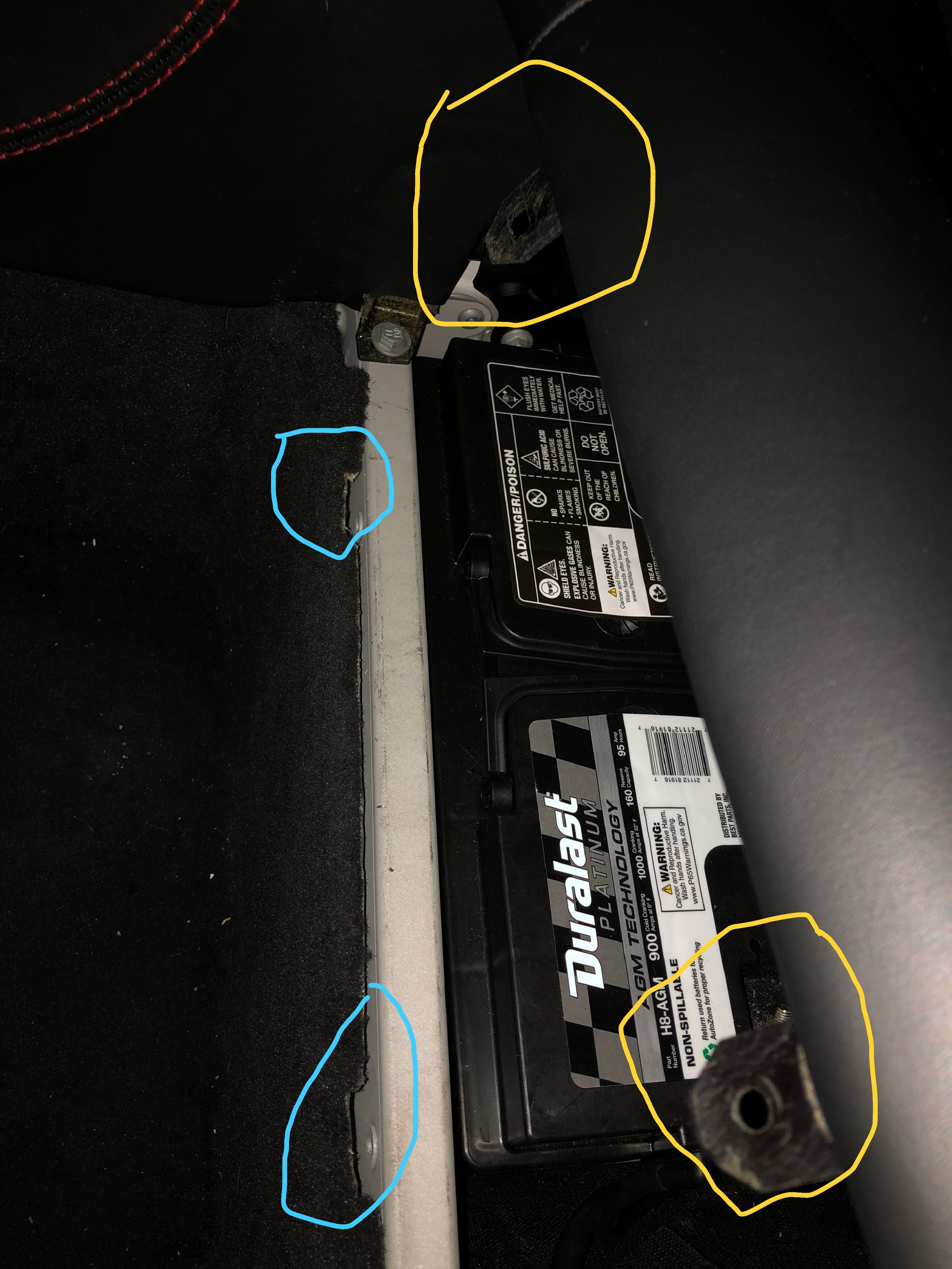The seat brackets are in yellow, the mounting positions behind the carpet in blue.