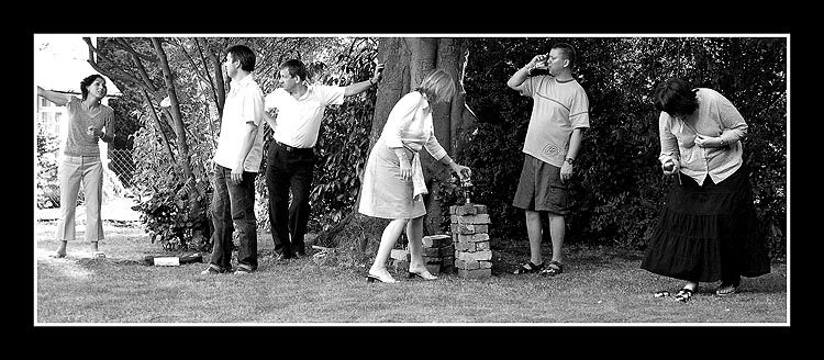 Cropped a bit tight at the top but I think the agitated woman on the left is saying 'I left you to do the burgers and they're still in the bloody freezer...'