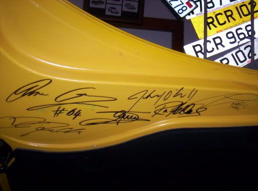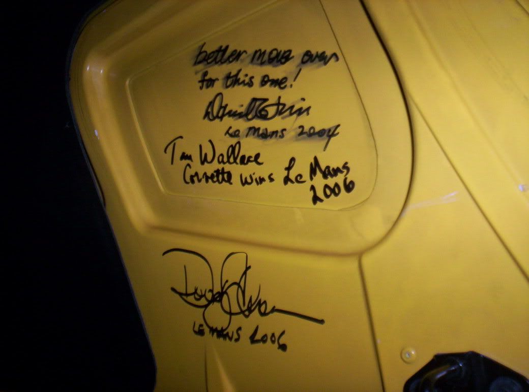 Whislt assembling for the Driver's Parade on Friday evening, I persuaded all six Corvette Racing drivers to sign the inside of my bonnet. There was alot of frantic activity with the Drivers and photographers all crowding round the car. It was only after the dust had setled that I counted only 5 signatures