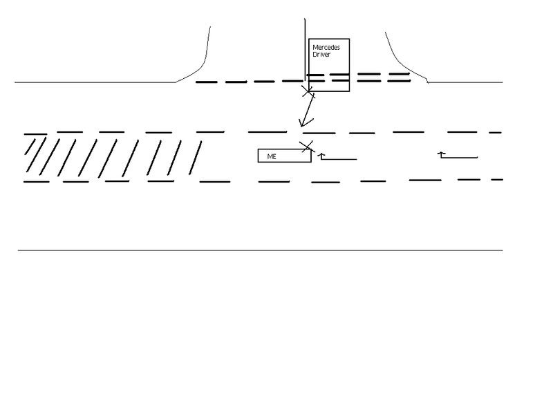 I was turning into the side road as the man in the merc was trying to turn out. It is quite a busy road and as I was waiting to turn into the road, he saw a gap and shot out. Straight into my back wheel. The bike tipped over and landed on the left hand side. I think I managed to stay on my feet and the bike just slid down my leg but I cant really remember. I had all my gear on (helmet, gloves, jacket, over trousers and my boots) and I'm fine apart from the bottom of my back where I have tried to pick the bike up. He reversed after I had lost my temper a little bit but it dragged my bike back with it as it was stuck underneath. I had to lift my bike to a 45 degree angle while he reversed off as it was caught on his bumper. I moved my bike to the edge of the road and he tried to calm me down and helped me stop shaking. Luckily there were two people who saw what happened and stopped to help. One person has given me her contact details. I phoned my dad and he came out to help me. The driver has taken full responsibility but I hope his insurance don't try and pass the blame on to me (I was stopped with my feet on the floor!).