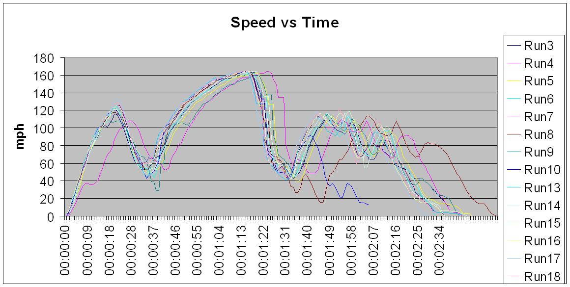 If you really want to get sexy you could investigate true X-Y-Z scatter graphing capabilities which would allow the speed in each run to be plotted on the Z axis against the position in X and Y. cool Before you look, Excel doesn't have it as standard .... frown