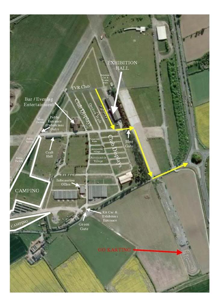 For the cavalcade at 1.30pm on Sunday we will unlock the Blue Gate for you to exit the showground. The cavalcade can pass from your club stand passed the Exhibition Hall and then turn left out of the Blue Gate. There should be no cars on that roadway. At the end of that roadway we recommend the cars turn left so they do not need to cross over the road. This we feel is the safest way out of the showground and you should get less likely hood of being held up. Coming back onto the showground after the scenic tour all cars must come back through the Green Gate the Kit Cars and Exhibitors entrance. The Blue gate will be locked again. I have attached a map, the yellow arrows showing the route out of the showground through the Blue Gate. The red arrow shows where the Go Karting track is so that you can see where it is in relation to the showground.. Hope this is helpful