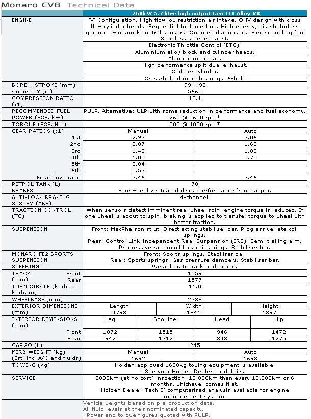 We never got the choice here in the UK and I for one would have probably picked the auto instead of the high geared manual. I have wondered about buying another CV8 and converting it. The 4L65 appears cheaper than the T56. Maybe tricky interfacing it to the engine however unless it simply plus in. Here is the Australian VZ specs manual and auto: