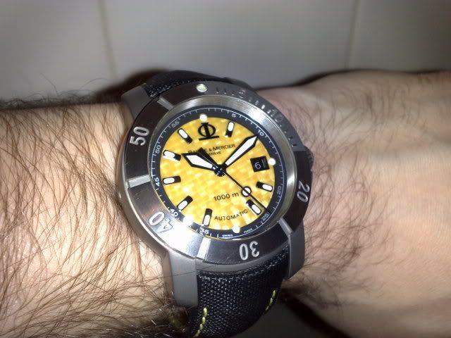 Fell in love with this over the Christmas period and managed to track one down just before the new year. It's a Baume & Mercier Capeland S XXL - they are quite rare and hard to come by as they never sold particularly well when new. It's got a beautiful titanium case, woven kevlar dial which looks stunning in the flesh and is currently on its sailcloth strap. It definitely feels every bit as expensive as its original £2500 retail price would have you believe! It's managed to knock my beloved Ball off my wrist in the past few weeks and I must say I am over the moon with it, absolutely stunning watch.