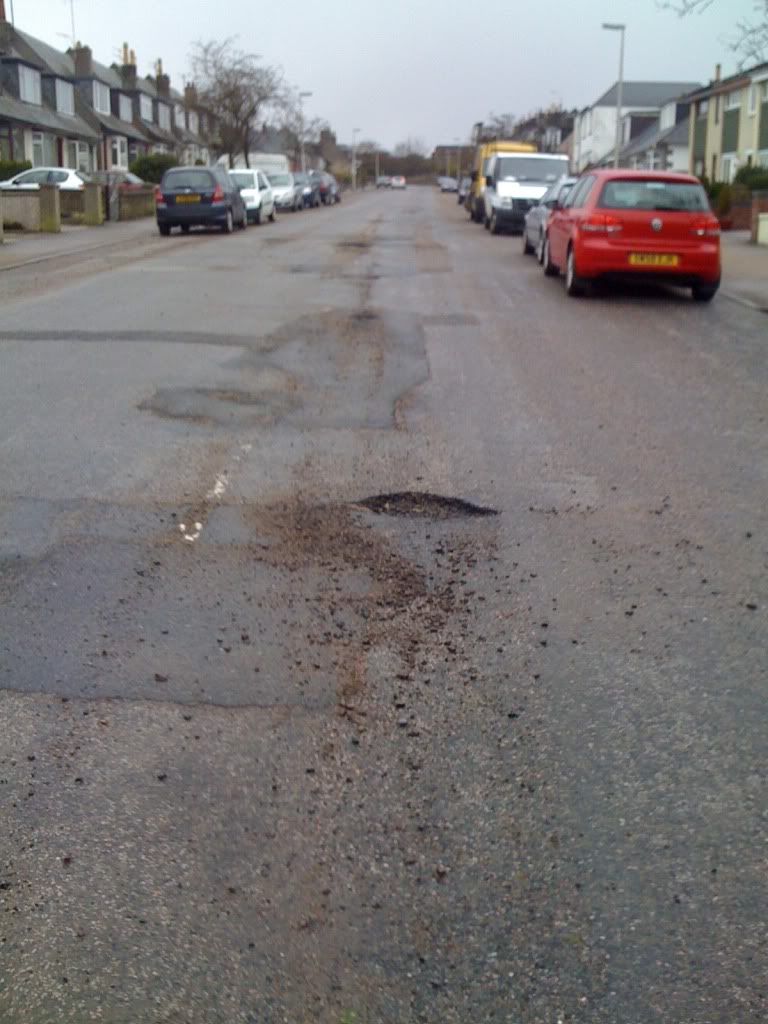 Aberdeen is an absolute joke at the moment, was taking the parents into town yesterday and going up Don St. in the pishing rain, hit a pothole and there was an absolutely massive bang, car jolted and gave a hell of a fright. Car seemed alright (And nothing fell off the dashboard, suprising for an MG!) but it's taking the piss, and that road is well known for being a state.