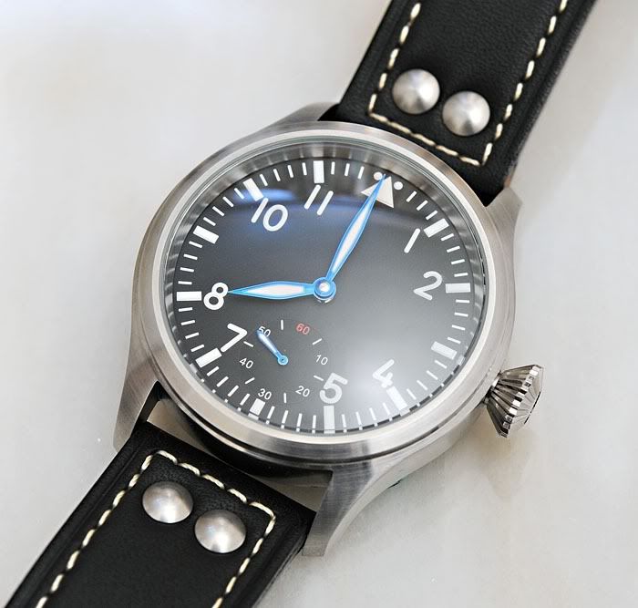 A "Poor Man's Big Pilot" that a TZ'er built using a 46mm Getat case, a Seagull movement and a very nice dial/hand combo.