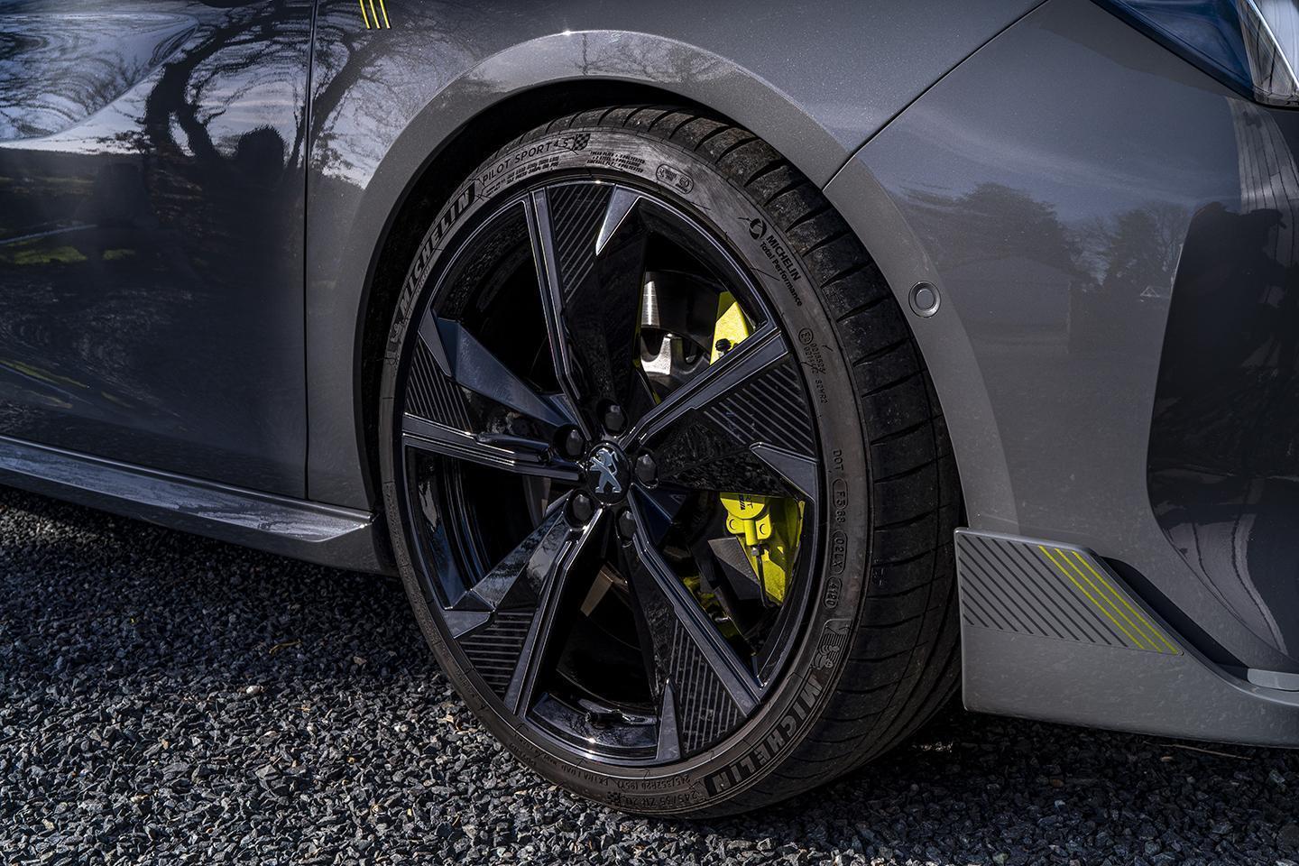 The four-cylinder unit is familiar from the 208 GTI, a car that Peugeot Sport did terrific things with back in middle of the last decade, with a 200hp output that's supplemented by the brace of 11.5kWh battery-powered motors, a 110hp one on the front axle and a 113hp one at the back. Consequently, the all-wheel drive configuration is biased towards the nose, and marshalled via an eight-speed automatic gearbox. Combined torque peaks at a muscular 384lb ft, which is 74lb ft better than a BMW 330e.