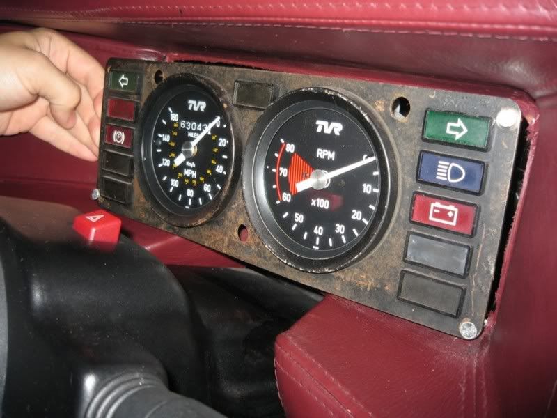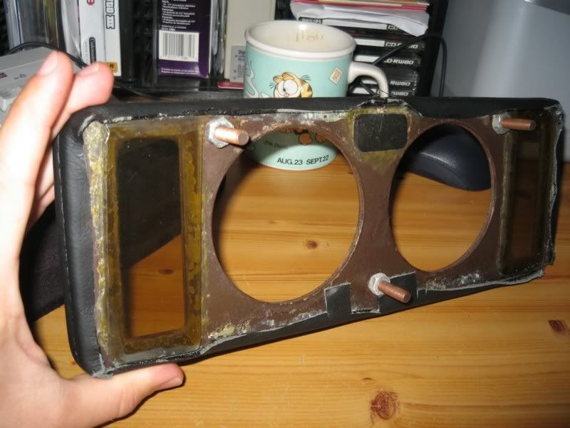 The inner panel is another sheet of steel which the dials are mounted to. This is kept in place with 4 screws that go through the panel in all 4 extreme corners. On the back of the screws, there are 7mm nuts. This screw / nut arrangement keeps everything secure to the fibreglass dash. Attached photo of inner panel - note the 3 locating holes for the outer panel.