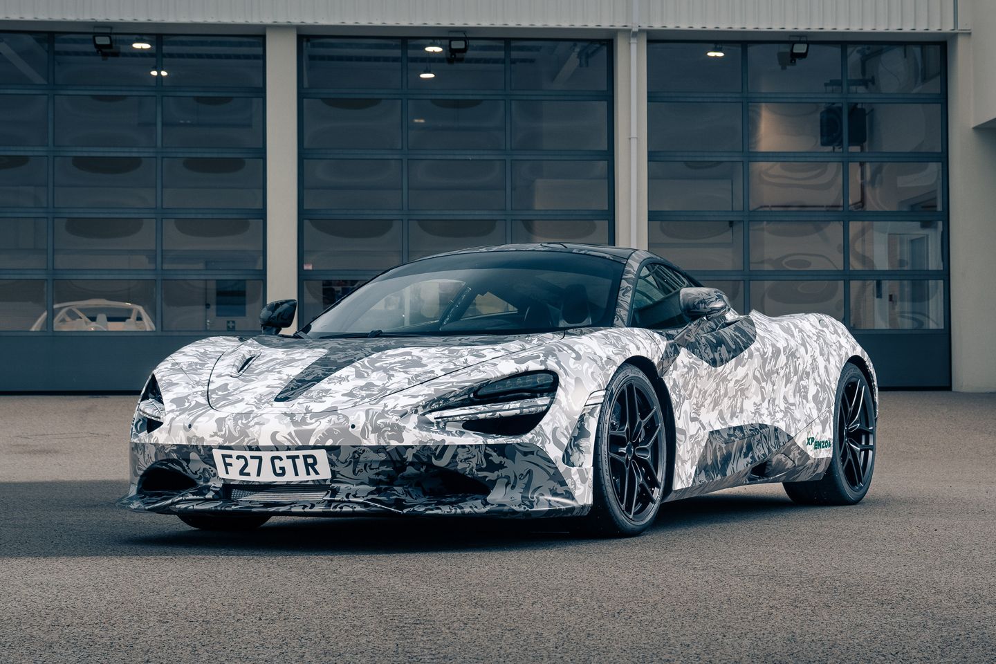 To demonstrate the new layout, Lanzante invited us for a passenger ride around Goodwood circuit in one of its early development mules. It’s so early in its development, in fact, that it still resembles a camouflaged 750S that’s minus some bodywork. The back end, for instance, has a good chunk missing to accommodate the 95-59’s lower exhaust exist, while the curvy rear lights have been replaced by a set of rudimentary LED strips. And so you don’t mistake it for one of Woking’s prototypes, the pattern of the camo wrap is based on the company’s Ganesh logo and alludes to shape of the final product.