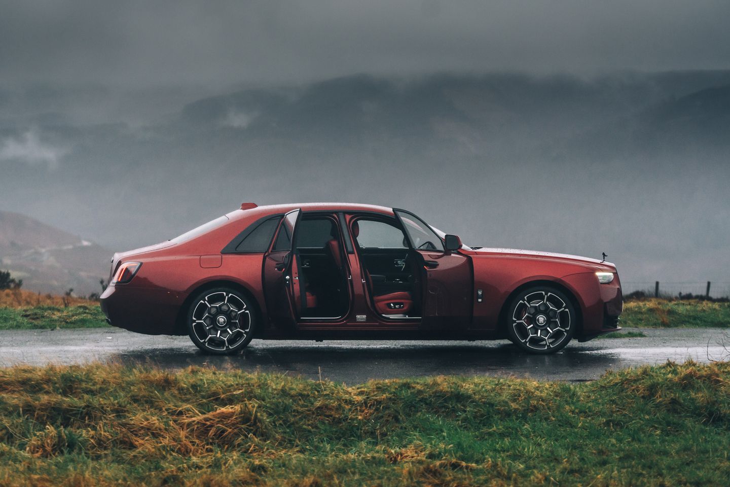 Our photoshoot, if Oli B’s fine bunch of stills don’t portray it, took place in the eye of wet, windy storm thrashing South Wales. Rarely has it seemed less of an issue, the sheer heft of the Ghost – a car insulated better than my house – ensuring the interior remained a tranquil respite from it all. Even shutting its vast doors via the prolonged pull of a switch stops your arm being wrenched from its socket by a sudden gust. And yes, the interior avoids screens where possible and offers a decadent safe space for proper switchgear. It’s celebrated rather than shunned, the metal air vents and the rolling dials of their temperature controls a particular highlight.
